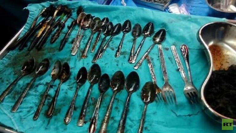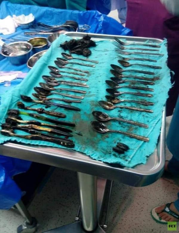 وبعد الفحص الطبي بالمنظار والأشعة، تبين وجود أجسام ضمت عددا من الملاعق والشوك وخاتم ذهب وسلاسل وأجسام أخرى تمكن الفريق الجراحي من استخراجها.