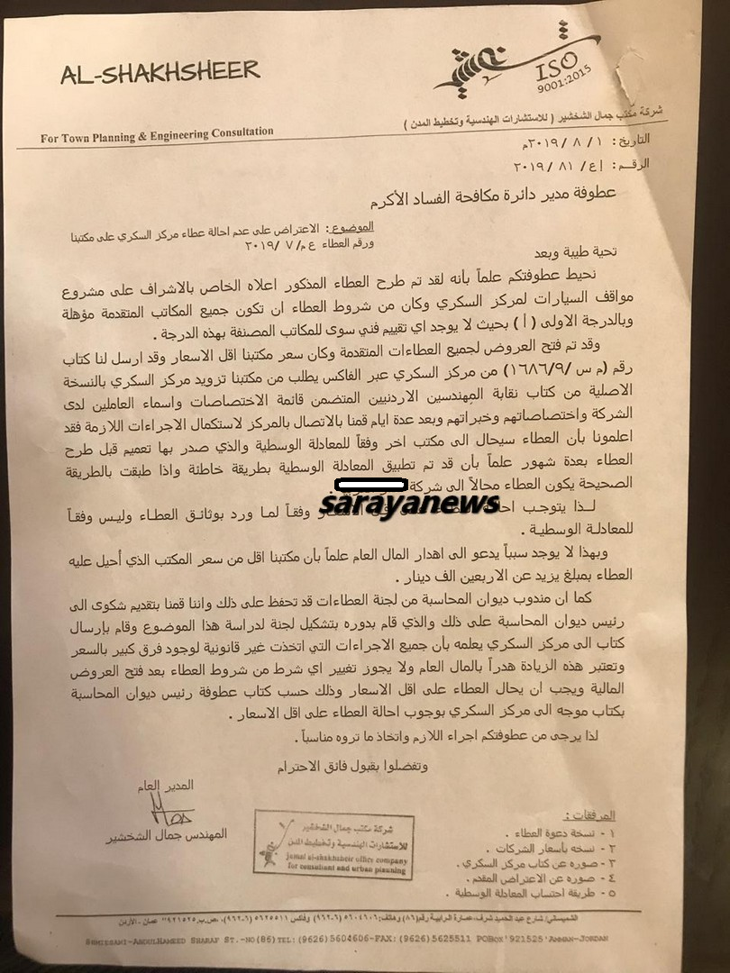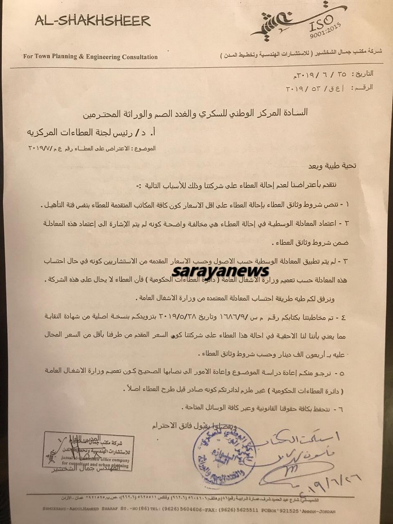 و قام صاحب الشركة التي تقدمت بالسعر الاقل والبالغ 118 الف دينار بتقديم شكاوى لدى هيئة مكافحة الفساد و ديوان المحاسبة حول تفاصيل ما جرى ، وتعليقاً على تلك الشبهات قامت سرايا بالتواصل مع مركز السكري و بادر نائب مدير عام المركز محمد الخطيب بالتوضيح لسرايا حول العطاء ، مشيراً الى ان العطاء أُحيل الى الشركة التي حصلت على العطاء ضمن الاصول ، و عند الاستفسار حول آلية الاختيار و لماذا لم يتم اختيار الشركة الاقل سعراً أجاب الخطيب : لن اجيب على السؤال إلا بشكل خطي و بكتاب رسمي ، خاطبني خطي حتى اجاوبكم"، و رفض حينها الإفصاح على السبب على الرغم من انه اجاب على عدة اسئلة حول العطاء ولكن بمجرد السؤال عن اسباب عدم اختيار مكتب هندسي عن غيره رفض الخطيب الإجابة.