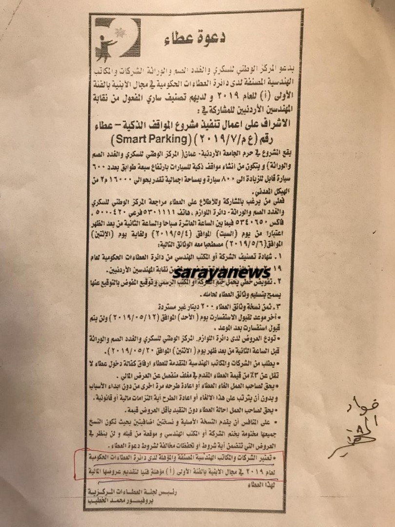 سرايا - سيف عبيدات - اكد مالك احدى الشركات الهندسية ان هنالك شبهات فساد و تجاوزات في عطاء تم إحالته على احدى الشركات الهندسية ، لغايات إنجاز مشروع مواقف ذكية للسيارات في المركز الوطني للسكري والغدد الصم والوراثة.