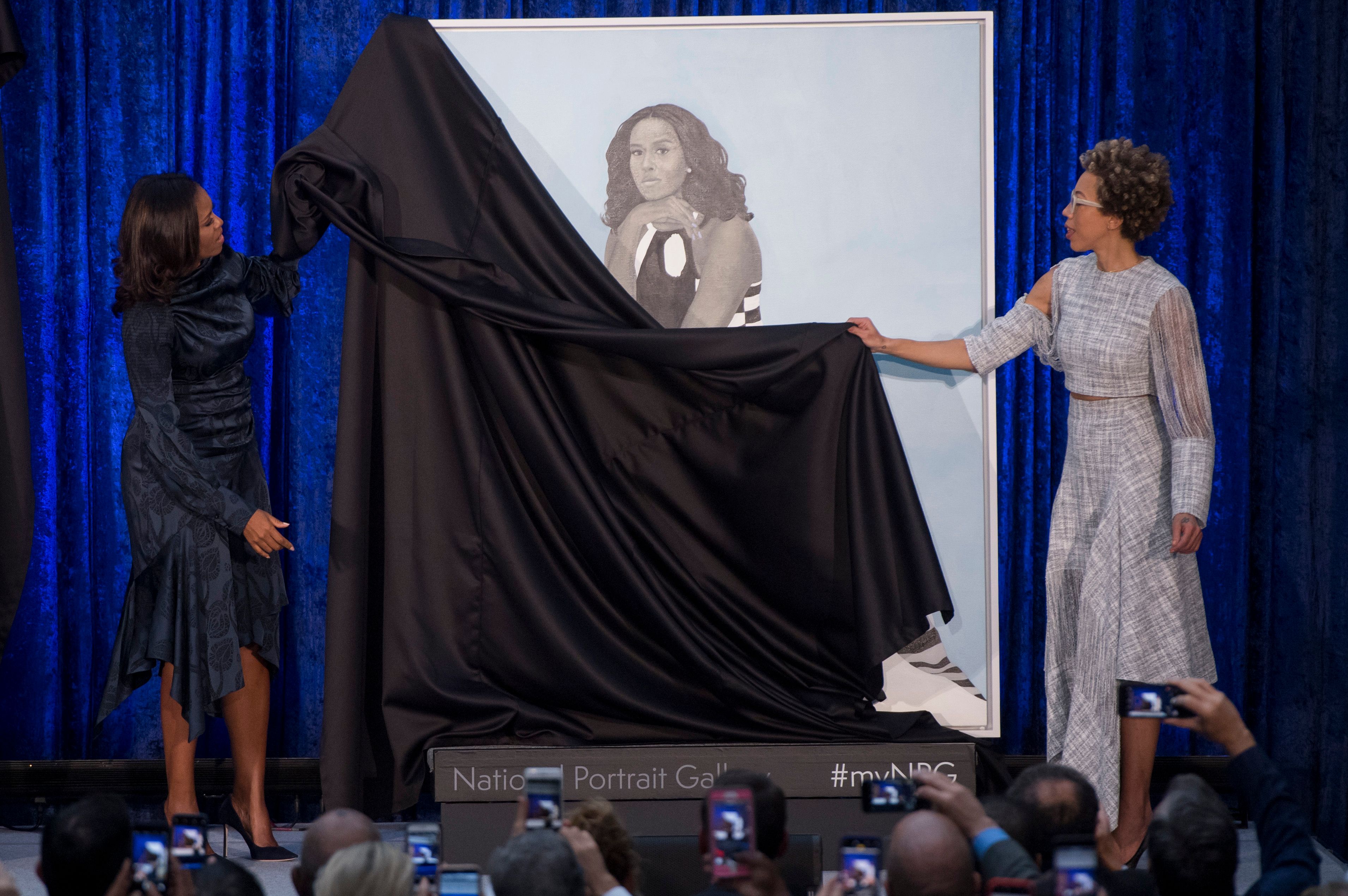 وجرى تصوير أوباما فى اللوحة التى رسمها وايلى جالسا على مقعد بنى اللون مع خلفية من أوراق الشجر الخضراء النضرة وزهور ملونة. ولوحة ميشيل تصورها جالسة وقد وضعت يدا أسفل ذقنها وأحاطت يدها الأخرى بكمبيوتر محمول، بينما كانت ترتدى فستانا طويلا فضفاضا مزينا بأشكال هندسية.