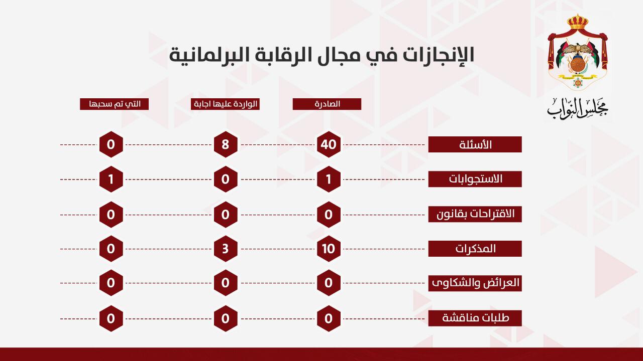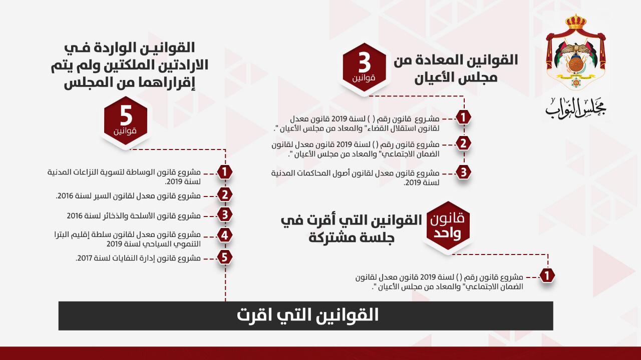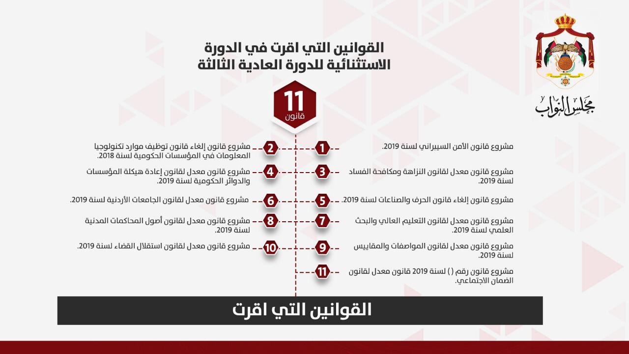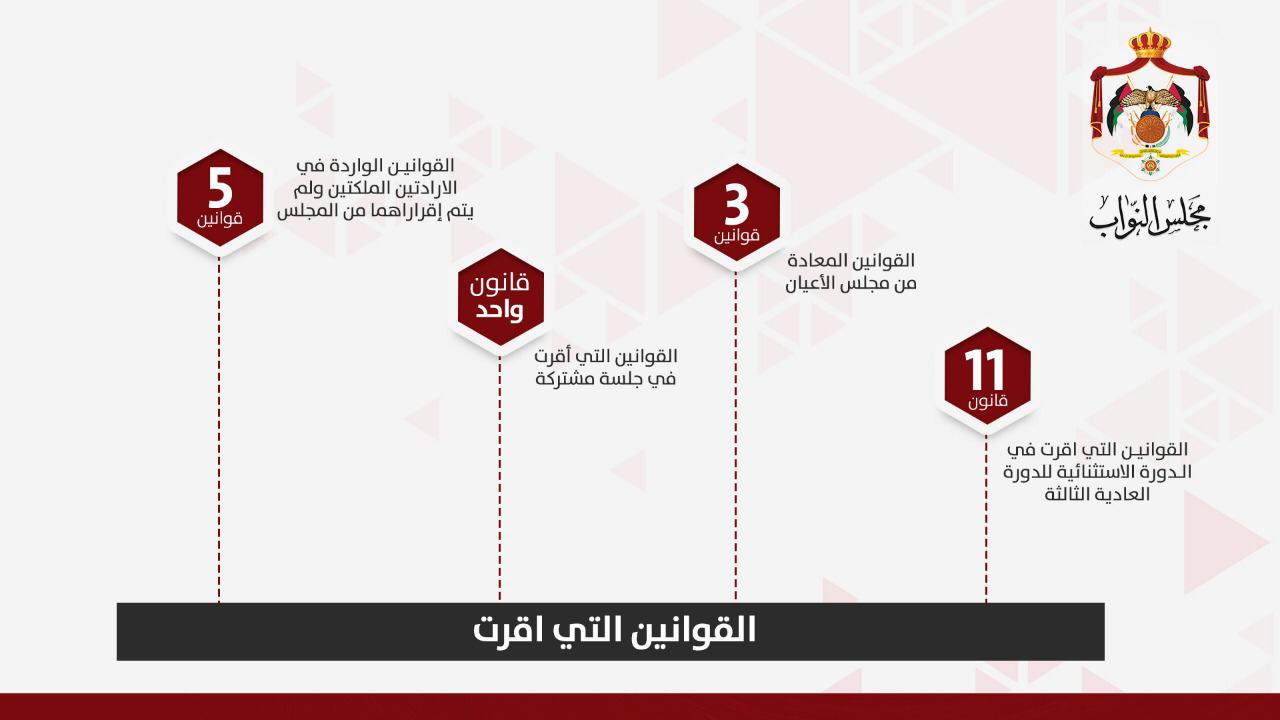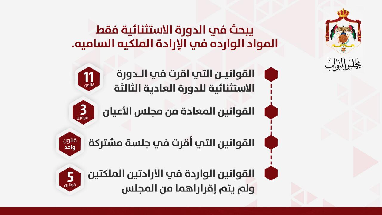 وأشارت من خلال رسومات (أنفوجرافيك) نشرتها مساء الثلاثاء، إلى أن مجلس النواب أقر خلال الدورة الاستثنائية 11 قانوناً، فيما بلغ عدد القوانين المعادة من مجلس الاعيان 3 قوانين، وقانون واحد أقر خلال جلسة مشتركة، فيما لم يتم إقرار 5 قوانين وردت في الإرداتين الملكيتين.