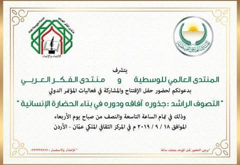 سرايا - استمراراً للنشاط الفكري والثقافي والتوعوي والإرشادي الذي يقوم به المنتدى العالمي للوسطية من إجل إبراز صورة الإسلام الحقيقية بأنقى صورها، ودعماً لكل جهد مشترك تتبناه المؤسسات الفكرية والثقافية ذات الإهتمام المشترك، يأتي انعقاد هذا المؤتمر الذي ينظمه المنتدى العالمي للوسطية وبالتعاون مع منتدى الفكر العربي بعنوان: التصوف الراشد: جذوره وآفاقه، ودوره في بناء الحضاره الإنسانية يوم الأربعاء الموافق 18/9/2019 في المركز الثقافي الملكي، إذ يشارك فيه عدد كبير من العلماء ورجال الفكر من الدول العربية والإسلامية،: ( من اليمن، وسوريا، والعراق، والسودان، وتركيا، والمغرب، وكردستان العراق)، إضافة إلى علماء من الأردن ليناقش مجموعة من المحاور والأوراق، منها: التصوف: حقيقته ومذاهبه وأشكاله، و التّصوف بين الروحانيات والماديات والتوظيف السياسي للتصوف، والتصوف والأبعاد النفسية، والتصوف.