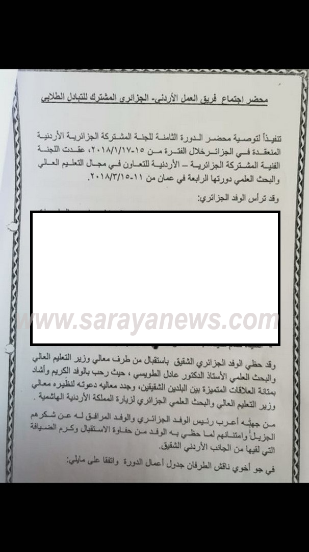 وأشار إلى أن الوزارة ذكرت على موقعها الإلكتروني (ضمن النشرة الإرشادية للطلبة الراغبين في الاستفادة من المنح الخارجية) أنّه لا يوجد ترشيح للجزائر لهذا العام لأنّ الجزائر لم ترسل موافقة على تنفيذ اتفاقية التبادل الثقافي لهذا العام!!! ،مبيناً إنه لم يحدد بعد الأسباب التي دفعت بالجانب الجزائري الى عدم الموافقة على تنفيذ اتفاقية التبادل الثقافي لهذا العام؟! ،متسائلاً عن الأسباب التي قد تكون أدّت الى هذا القرار الذي شكل خسارة كبيرة للطلبة الأردنيين! .