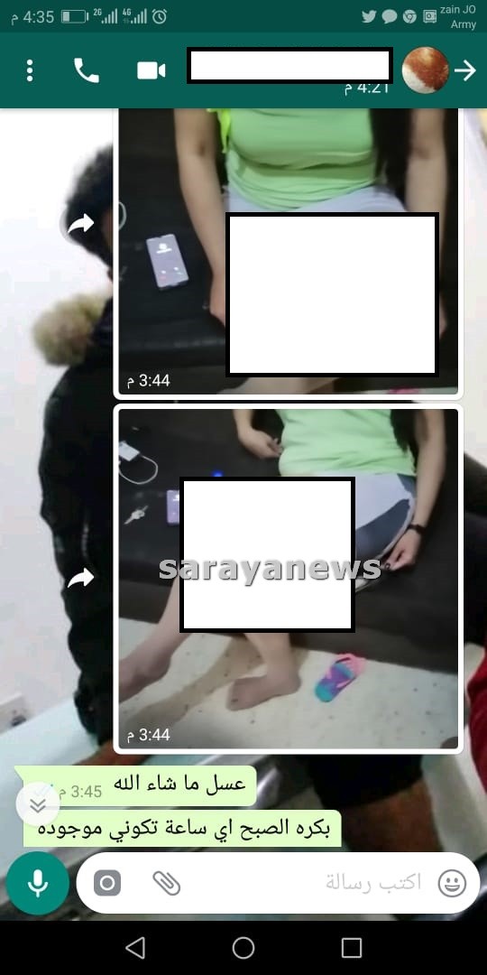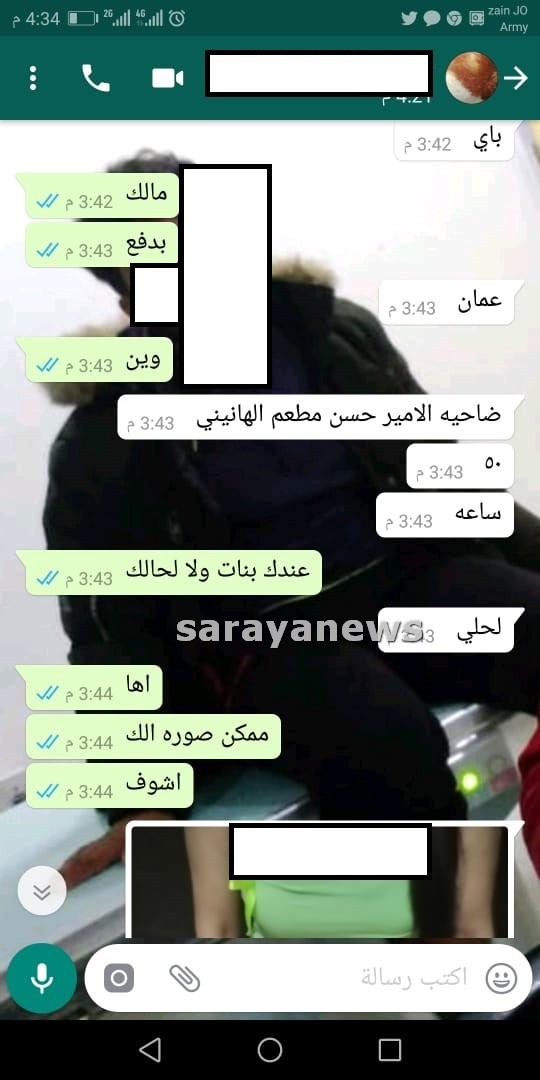 ولفت الشاب اثناء حديثه لـ"سرايا" إلى ان إحدى الفتيات قامت بمفاوضته على مبلغ مالي وتحديد الوقت والمكان عبر الواتس اب من اجل ممارسة الرذيلة ، لافتاً إلى إنها أرسلت إليه مجموعة من الصور التي تظهر من خلالهم شبه عارية بهدف إقناعه بالسعر الذي طرحته عليه ، موضحاً انه من الممكن ان يكون بداخل المنزل أكثر من فتاه كونه استطاع التواصل مع فتاتين فقط .