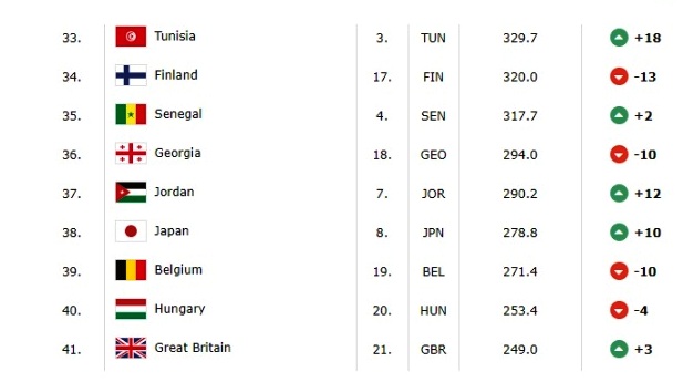 ورغم احتلالها المركز السابع في مونديال الصين، إلا ان الولايات المتحدة حافظت على صدارة التصنيف برصيد 786.4 نقطة، لتترك مركز الوصافة للمنتخب الإسباني (حامل اللقب) برصيد 731.5 نقطة، فيما جاءت استراليا بالمركز الثالث برصيد 673.6 نقطة، وتقدم المنتخب الارجنتيني “الوصيف” مركزا واحدا ليصبح في المركز الرابع برصيد 670.5 نقطة. (الغد)