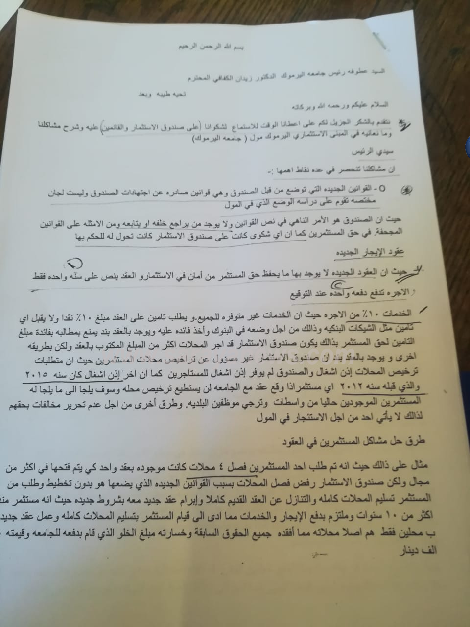 ولفت المصدر لسرايا بأن أحد المستثمرين طلب فصل 4 محلات كانت موجودة بعقد واحد كي يتم فتحها في اكثر من مجال ولكن صندوق الاستثمار رفض فصل المحلات بسبب القوانين الجديدة الذي يضعها هو بدون تخطيط وطلب من المستثمر تسليم المحلات كامله والتنازل عن العقد القديم كاملا وإبرام عقد جديد معه بشروط جديده حيث انه مستثمر منذ اكثر من 10 سنوات وملتزم بدفع الإيجار والخدمات مما ادى الى قيام المستثمر بتسليم المحلات كامله وعمل عقد جديد ب محلين فقط وهم بالأصل محلاته مما أفقده جميع الحقوق السابقة وخسارته مبلغ الخلو الذي قام بدفعه للجامعة وقيمته 20 الف دينار ، وتم زياده الخدمات عليه ووضع شروط تأمين في العقد الجديد ولمده سنه واحده فقط وبذالك تسبب بفقد الحق بالمطالبة بمبلغ الخلو الذي تم دفعه.