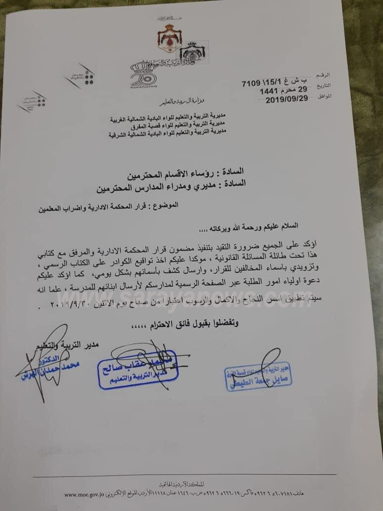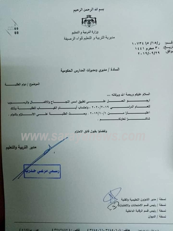 سرايا - أصدرت وزارة التربية والتعليم كتاب رسمي يقضي بتطبيق أسس النجاح والاكمال والرسوب للعام الدراسي 2019 -2020، واحتساب ايام الغياب للطلبة اعتبارا من تاريخ 1/10/2019 ، وحث الطلبة على الالتزام بالدوام الرسمي.