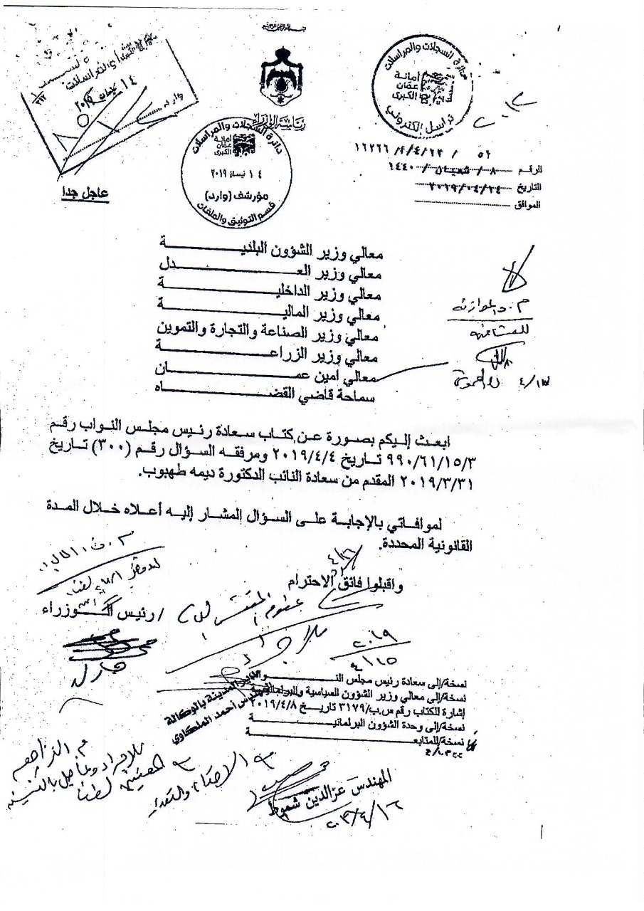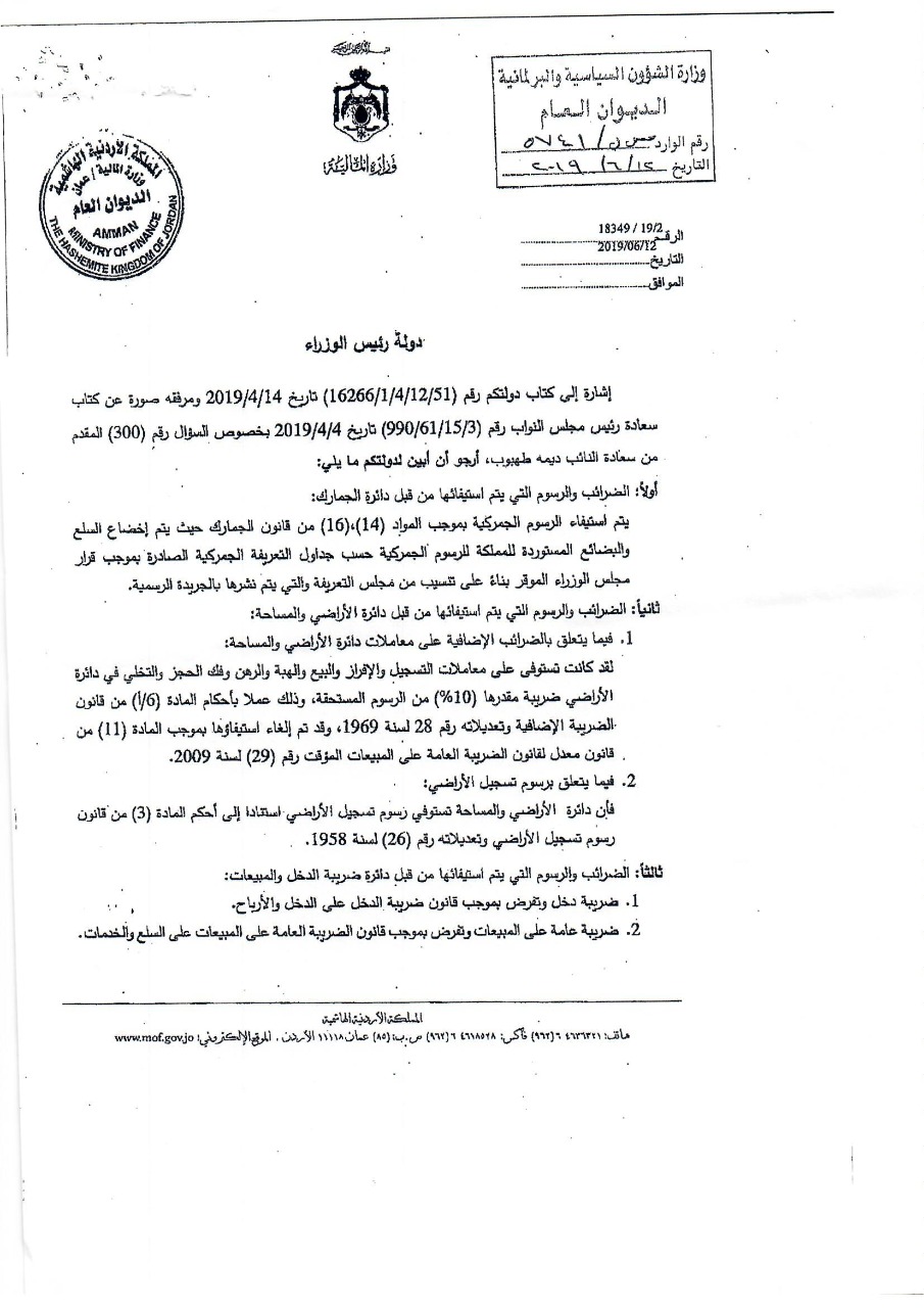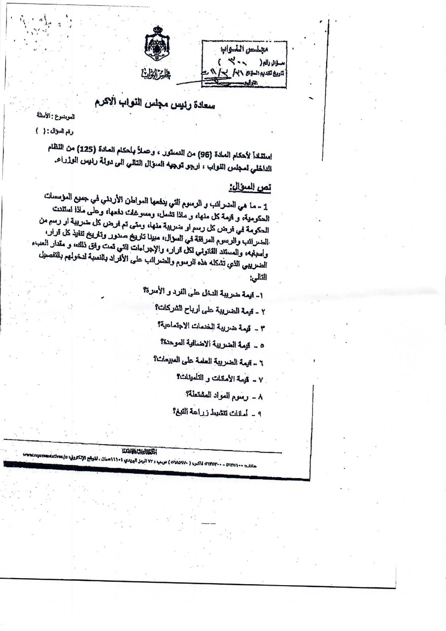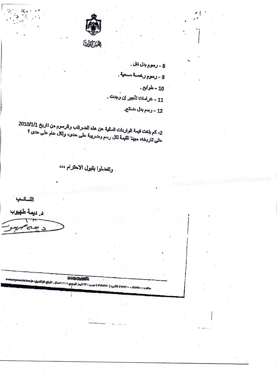 وكانت النائب طهبوب طلبت من الحكومة تزويدها بقيمة الايرادات التي حصلتها من المواطنين عبر عشرات الضرائب والرسوم خلال المدة من 1/1/2010 حتى تاريخ السؤال، ورغم قيام 6 وزارات ودائرة قاضي القضاة وأمانة عمان بإرسال بيانات عدة للرد على السؤال إلا أن دائرة قاضي القضاة كانت الجهة الوحيدة التي أجابت على السؤال النيابي المطلوب، فيما كانت باقي إجابات الوزراء قاصرة في ردودها وخلت من ذكر قيمة الإيرادات عن المدة الزمنية المطلوبة.