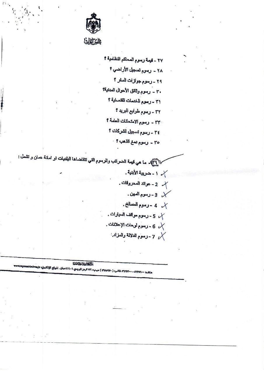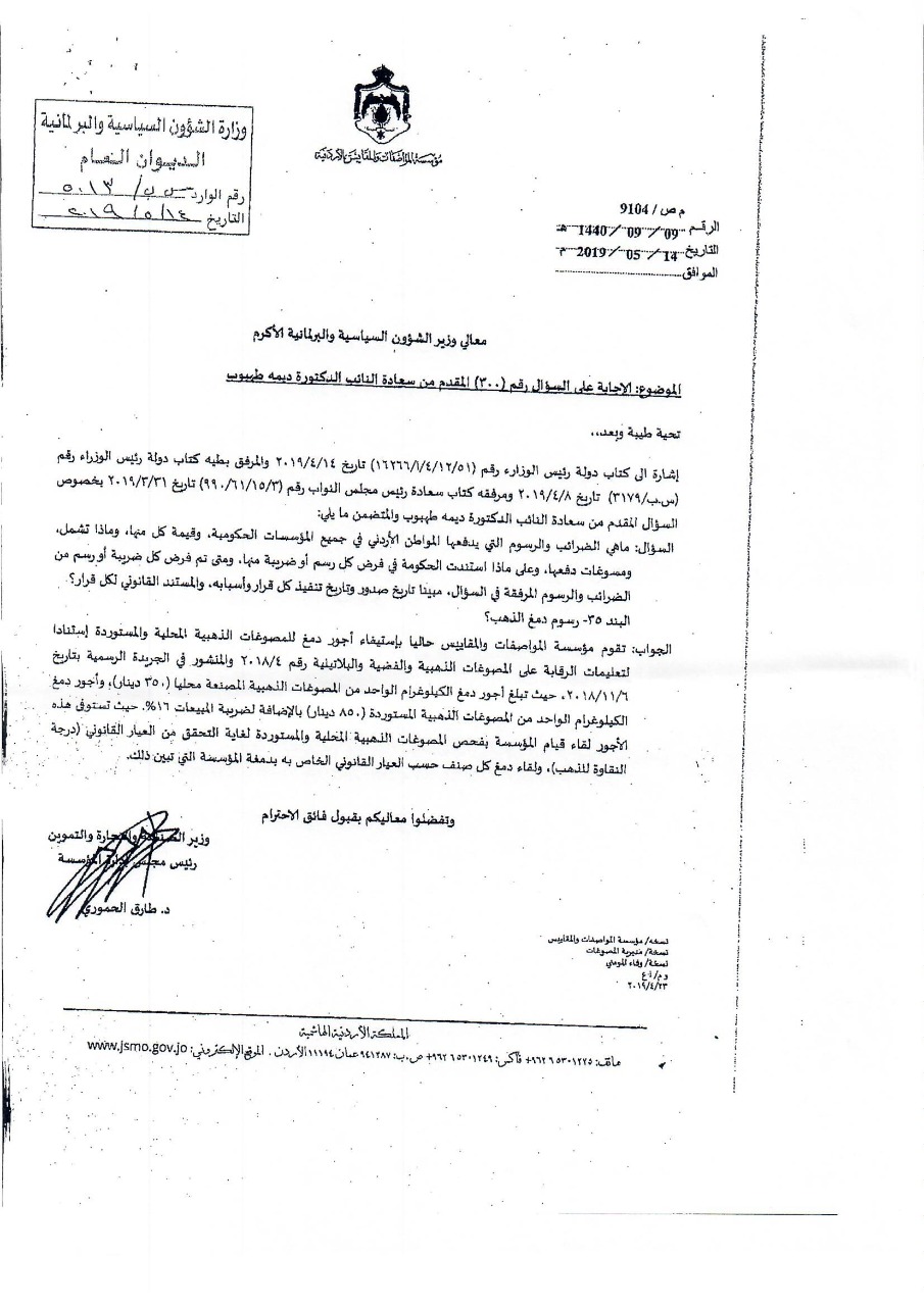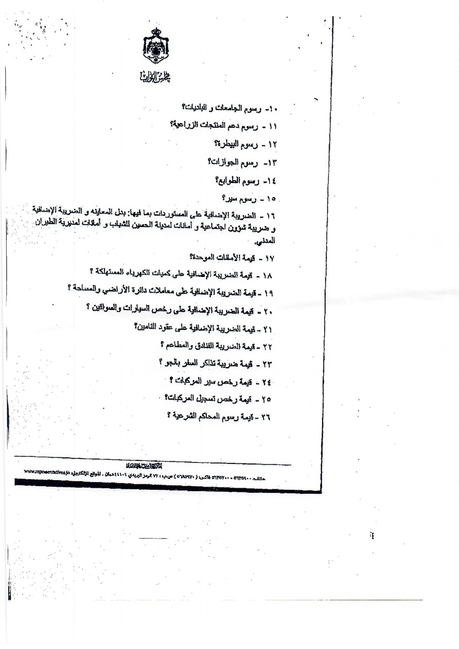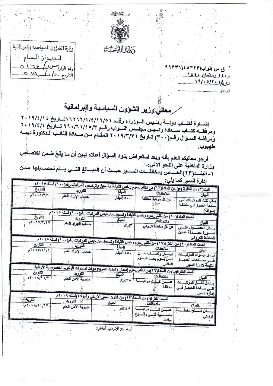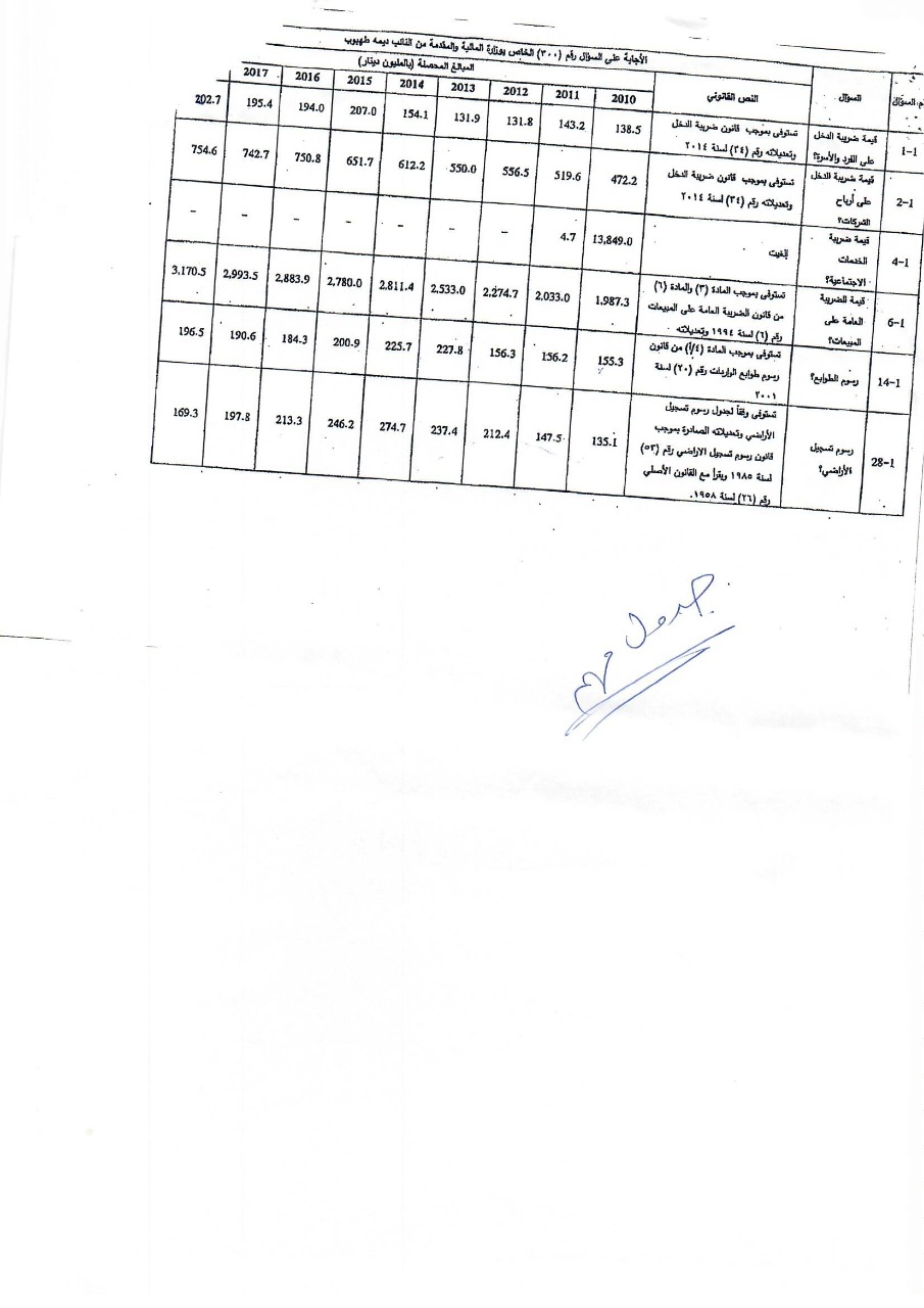 وكانت النائب طهبوب طلبت من الحكومة تزويدها بقيمة الايرادات التي حصلتها من المواطنين عبر عشرات الضرائب والرسوم خلال المدة من 1/1/2010 حتى تاريخ السؤال، ورغم قيام 6 وزارات ودائرة قاضي القضاة وأمانة عمان بإرسال بيانات عدة للرد على السؤال إلا أن دائرة قاضي القضاة كانت الجهة الوحيدة التي أجابت على السؤال النيابي المطلوب، فيما كانت باقي إجابات الوزراء قاصرة في ردودها وخلت من ذكر قيمة الإيرادات عن المدة الزمنية المطلوبة.