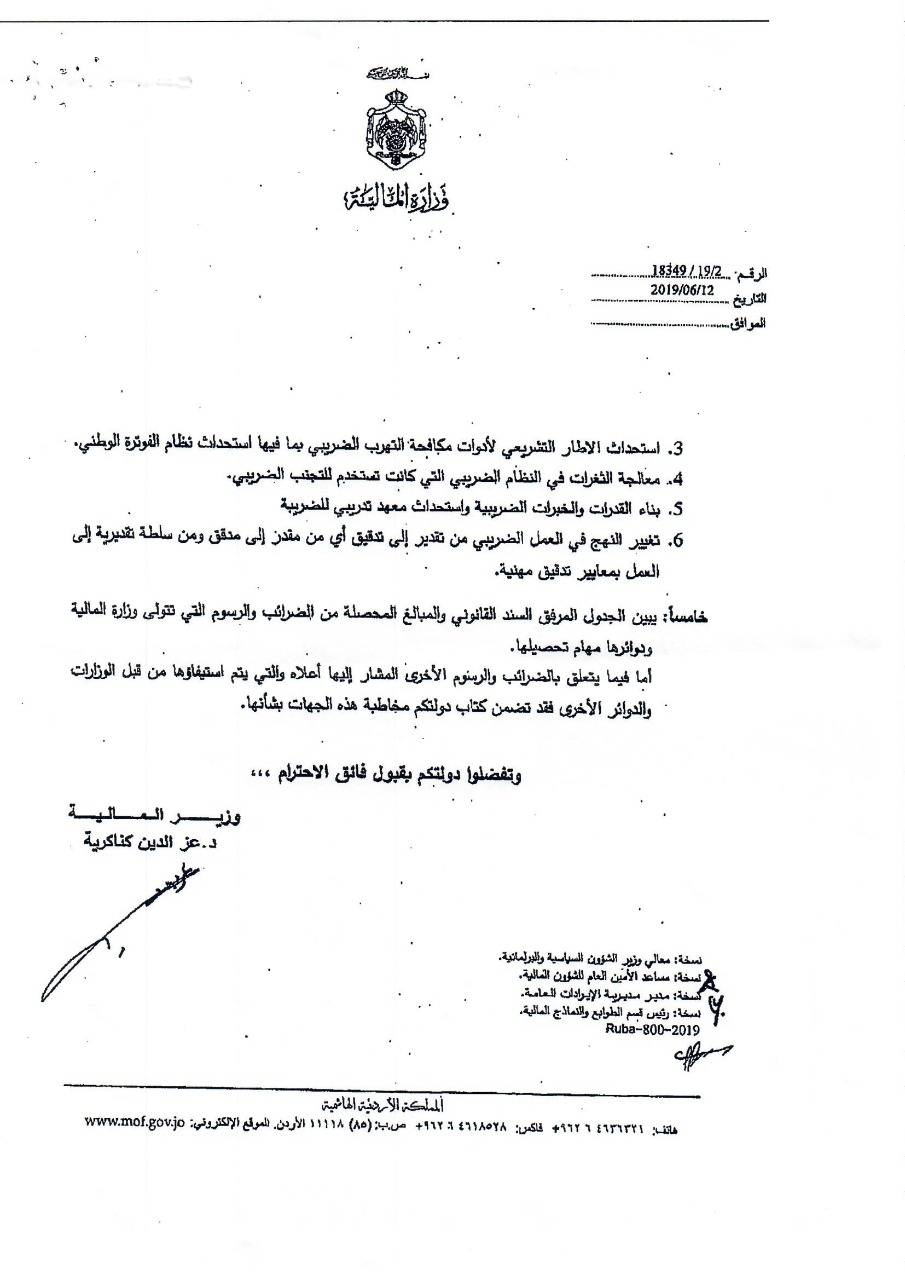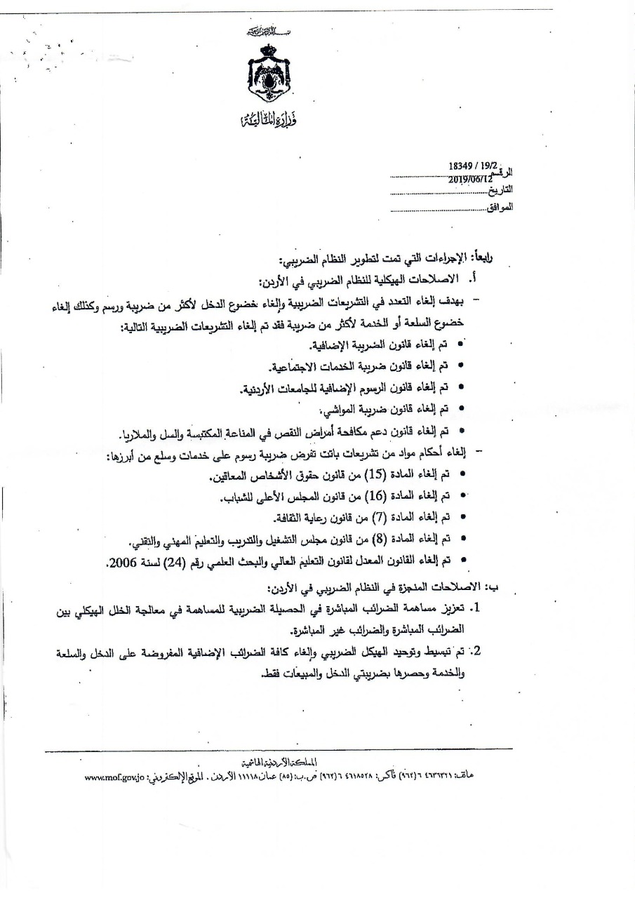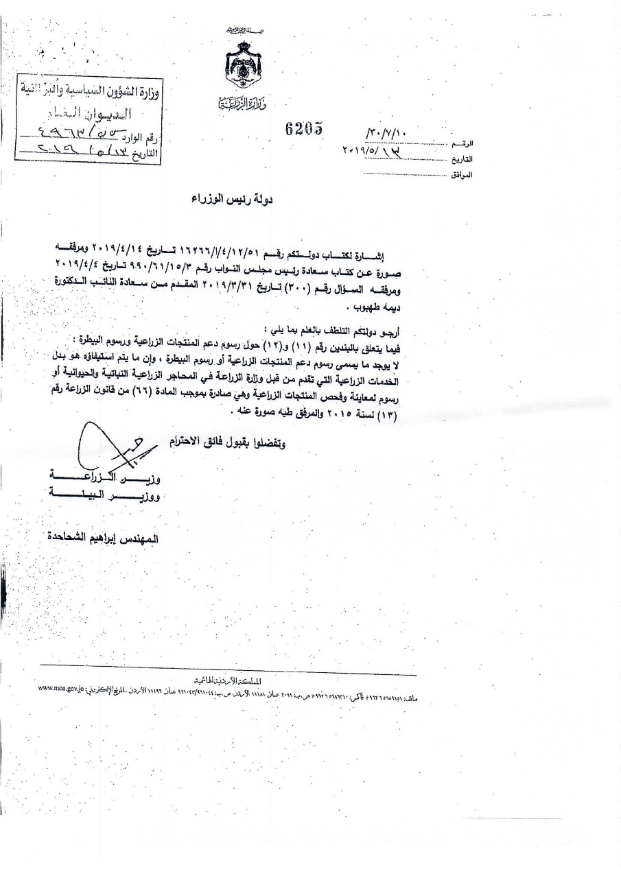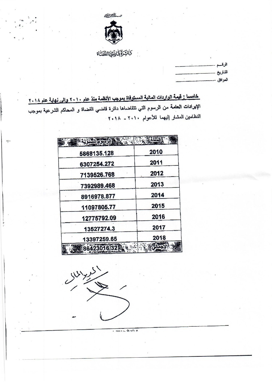 وكانت النائب طهبوب طلبت من الحكومة تزويدها بقيمة الايرادات التي حصلتها من المواطنين عبر عشرات الضرائب والرسوم خلال المدة من 1/1/2010 حتى تاريخ السؤال، ورغم قيام 6 وزارات ودائرة قاضي القضاة وأمانة عمان بإرسال بيانات عدة للرد على السؤال إلا أن دائرة قاضي القضاة كانت الجهة الوحيدة التي أجابت على السؤال النيابي المطلوب، فيما كانت باقي إجابات الوزراء قاصرة في ردودها وخلت من ذكر قيمة الإيرادات عن المدة الزمنية المطلوبة.