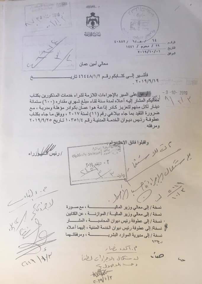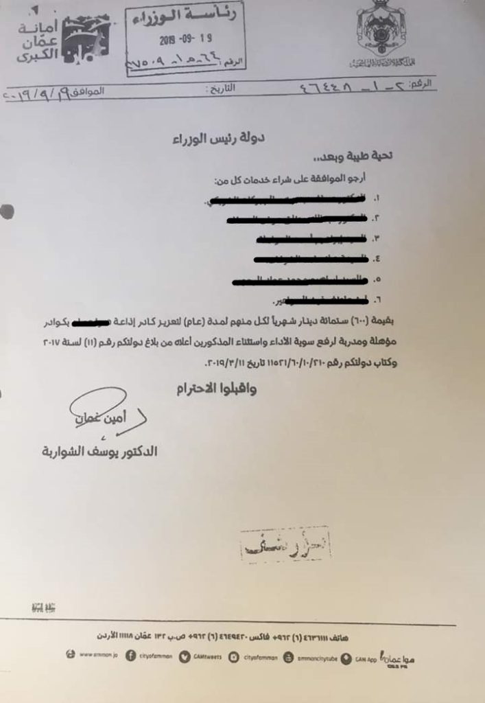 سرايا - وافق رئيس الوزراء الدكتور عمر الرزاز على كتاب أمين عمان الدكتور يوسف الشواربة، الذي يطلب فيه الموافقة على شراء خدمات نائب سابق وخمسة موظفين آخرين في إذاعة الأمانة وبراتب مقداره (600) دينار شهريا ولمدة عام