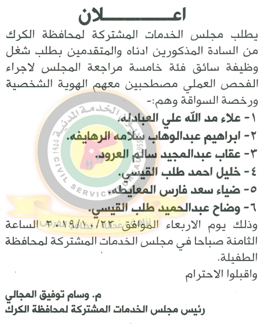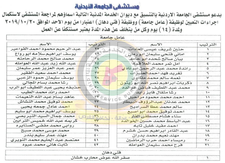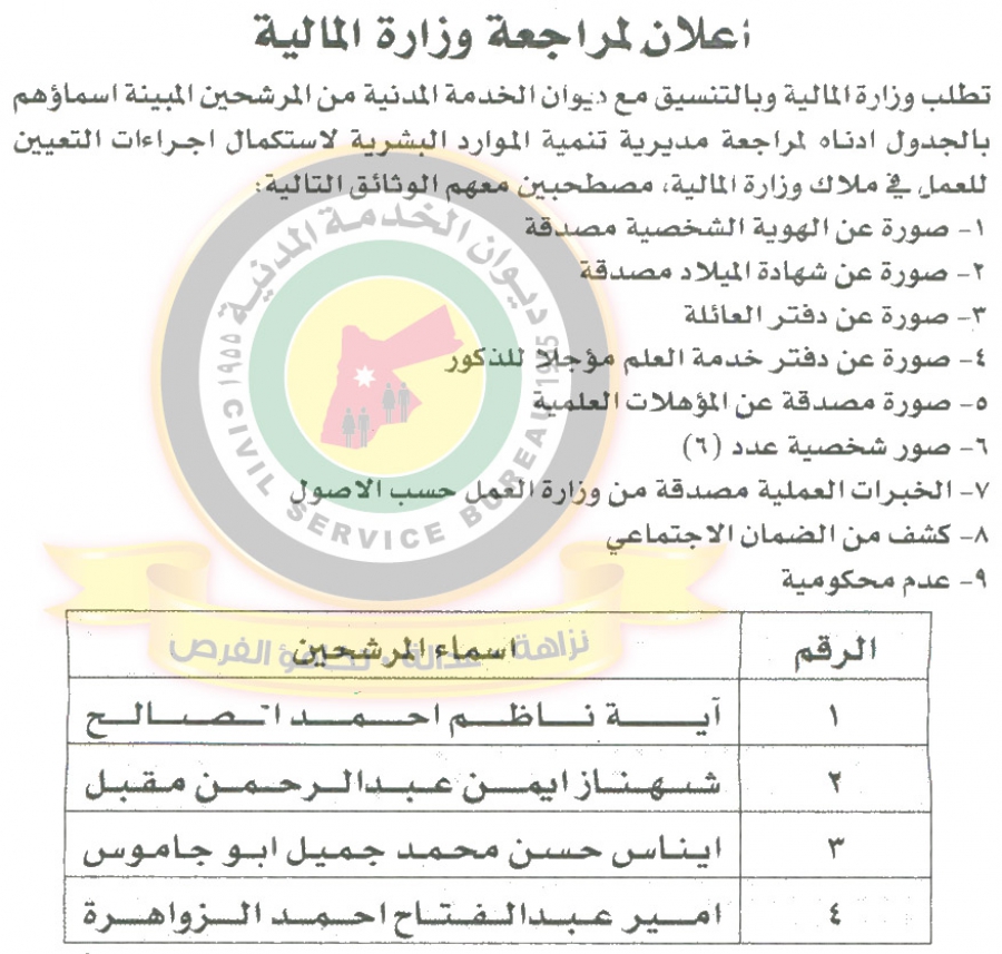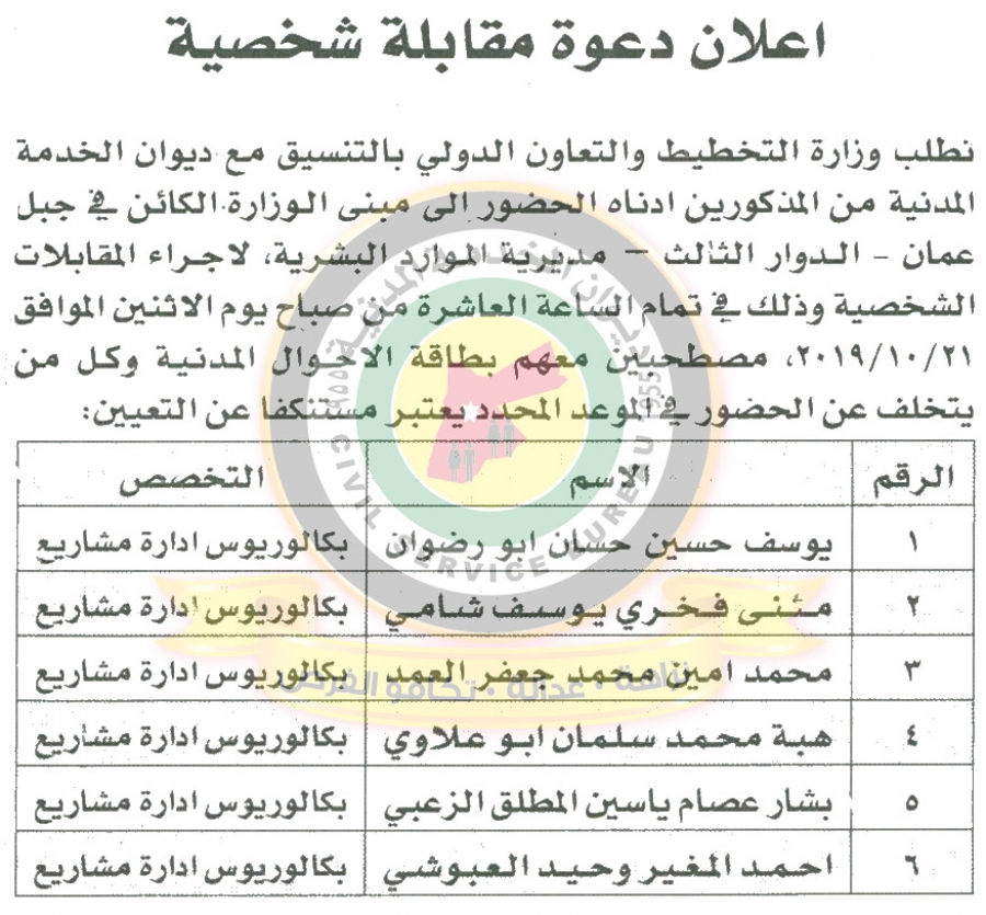 سرايا - دعا ديوان الخدمة المدنية بالتعاون مع مختلف الوزارات والمؤسسات الحكومية، التالية اسماؤهم لاجراء المقابلات الشخصية وعقد الامتحان التنافسي لغايات التعيين