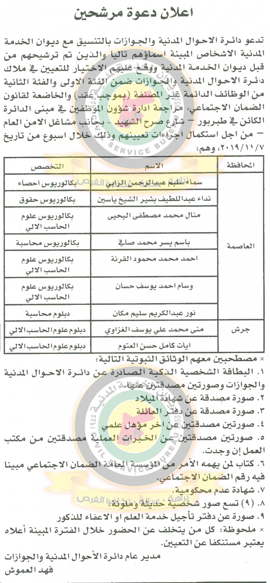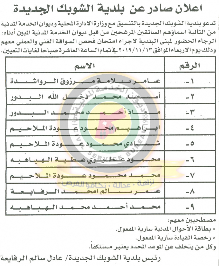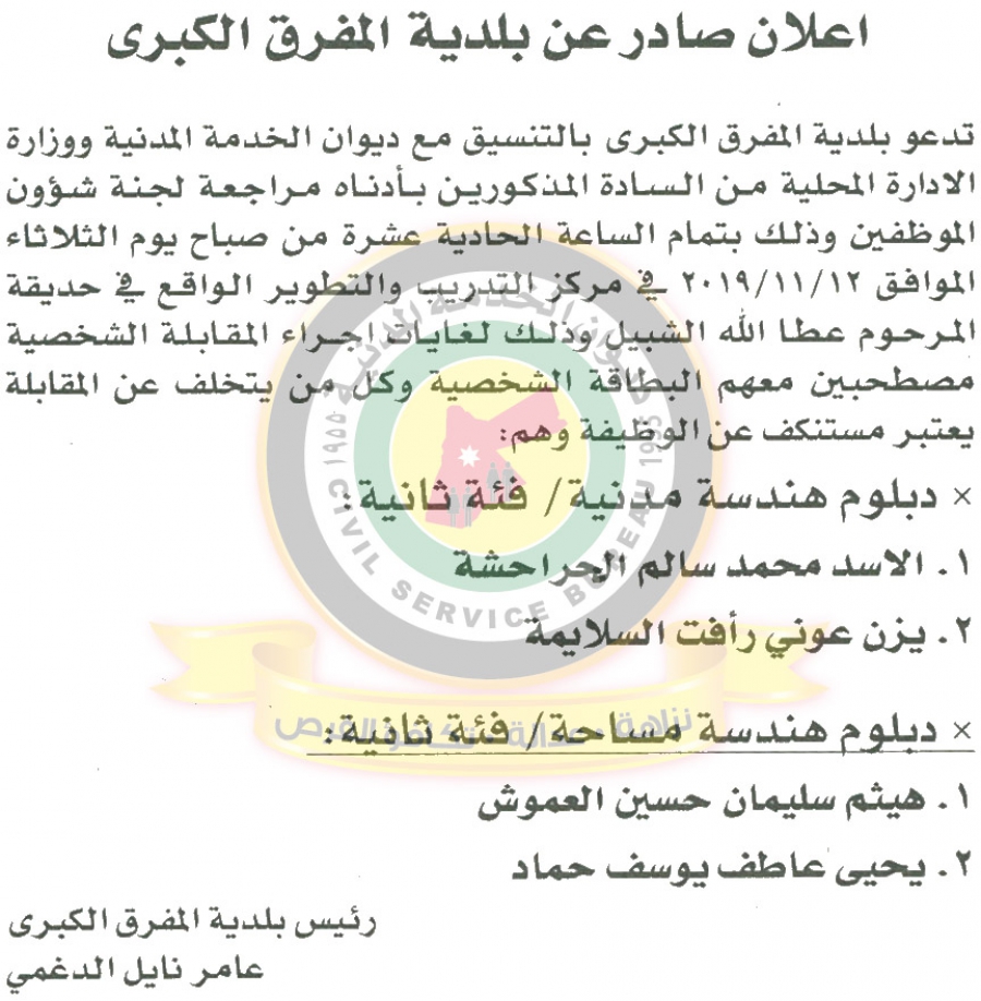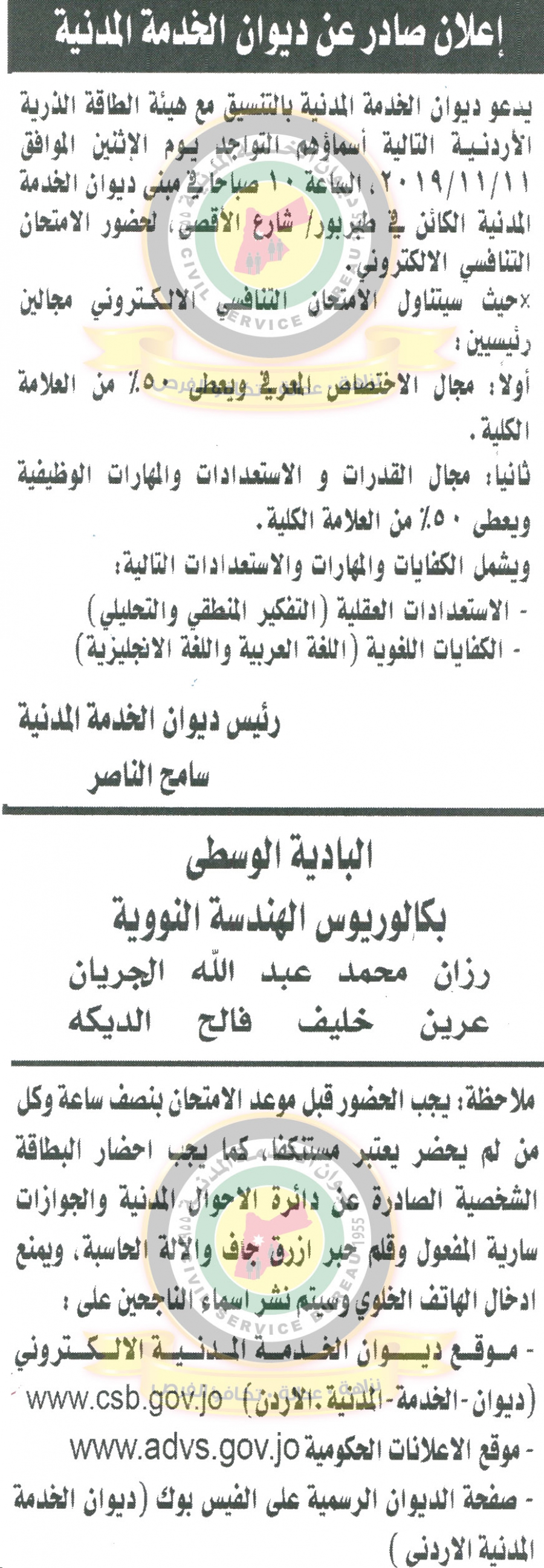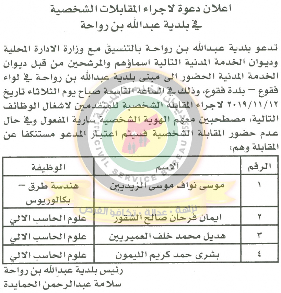 دعا ديوان الخدمة المدنية بالتعاون مع مختلف الوزارات والمؤسسات الحكومية، التالية اسماؤهم لاجراء المقابلات الشخصية وعقد الامتحان التنافسي لغايات التعيين.
