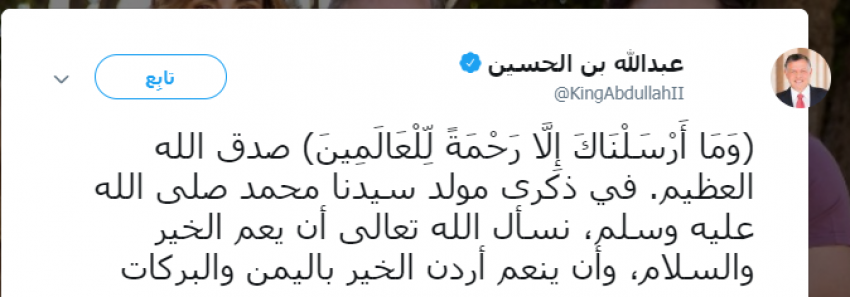 واقتبس جلالته الآية 107 من سورة الأنبياء (وَمَا أَرْسَلْنَاكَ إِلَّا رَحْمَةً لِّلْعَالَمِينَ) صدق الله العظيم. وجاء في تغريدة جلالته "في ذكرى مولد سيدنا محمد صلى الله عليه وسلم، نسأل الله تعالى أن يعم الخير والسلام، وأن ينعم أردن الخير باليمن والبركات".