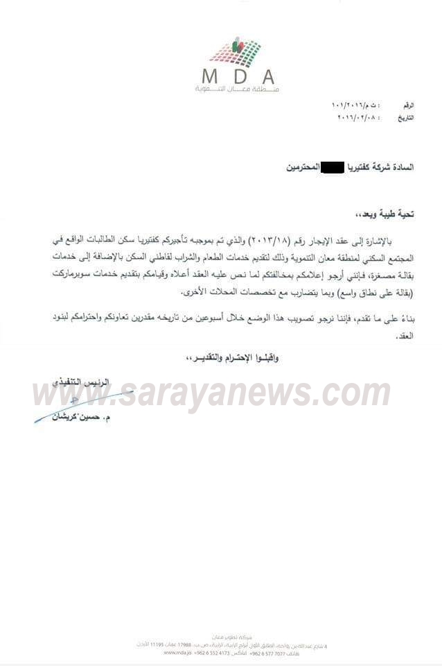 سرايا - معان – يوسف الطورة – أقامت شركة تطوير معان دعوى قضائية لدى المحاكم المختصة على شركة مشغلة لكفتيريا ضمن مجمع المباني السكني الطلابي لجامعة الحسين بن طلال تملكه الشركة، جراء التخلف عن سداد التزامات مالية بدل استئجار تقدر50 آلف دينار ، وأخرى إخلاء المأجور لانتهاء مدة العقد منذ نيسان العام الماضي.