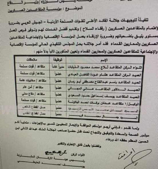 سرايا - تنفيذا لتوجيهات القائد الأعلى للقوات المسلحة الأردنية - الجيش العربي بضرورة الاهتمام بالمتقاعدين العسكريين (رفقاء السلاح) وتقديم أفضل الخدمات لهم وتوفير فرص العمل بمستوى يليق بتضحياتهم وضرورة الارتقاء بعمل المؤسسة الاقتصادية والاجتماعية للمتقاعدين العسكريين والمحاربين القدماء فقد أمر جلالته بحل المجلس التنفيذي الحالي للمؤسسة الاقتصادية والاجتماعية للمتقاعدين العسكريين والمحاربين القدماء وتعيين المذكورين بدلا منهم: