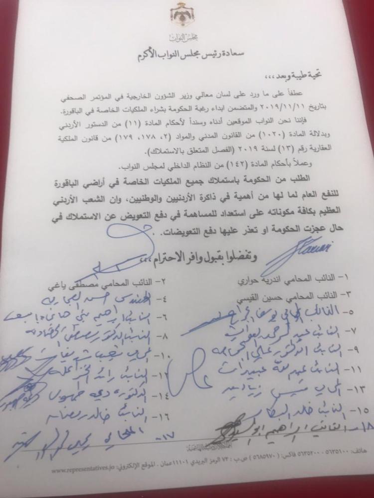 وقال النواب في المذكرة: إن الشعب الأردني العظيم بكافة مكوناته على استعداد للمساهمة في دفع التعويض عن الاستملاك في حال عجزت الحكومة أو تعذر عليها دفع التعويضات.