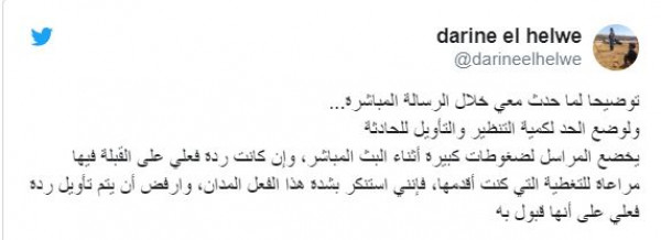 وغردت دارين الحلوة : "توضيحا لما حدث معي خلال الرسالة المباشرة… ولوضع الحد لكمية التنظير والتأويل للحادثة يخضع المراسل لضغوطات كبيرة أثناء البث المباشر، وإن كانت ردة فعلي على القبلة فيها مراعاة للتغطية التي كنت أقدمها، فإنني استنكر بشدة هذا الفعل المدان، وارفض أن يتم تأويل ردة فعلي على أنها قبول به".