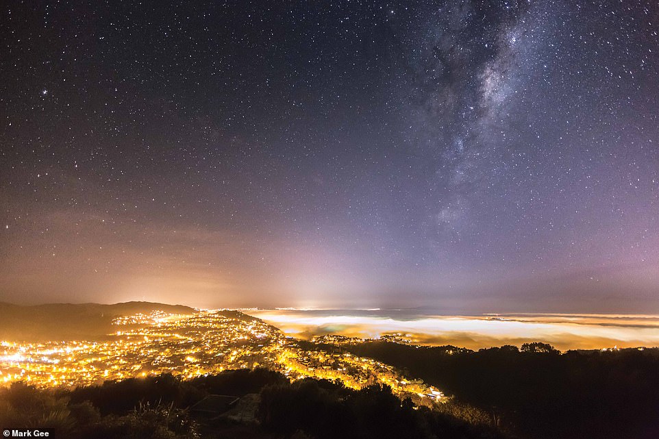 أضواء ذهبية تنبعث من طيات الغيوم، وتشرق في السماء الضبابية بشكل يفوق التصور، وتتناثر النجوم حول درب التبانة من تل Wrights.