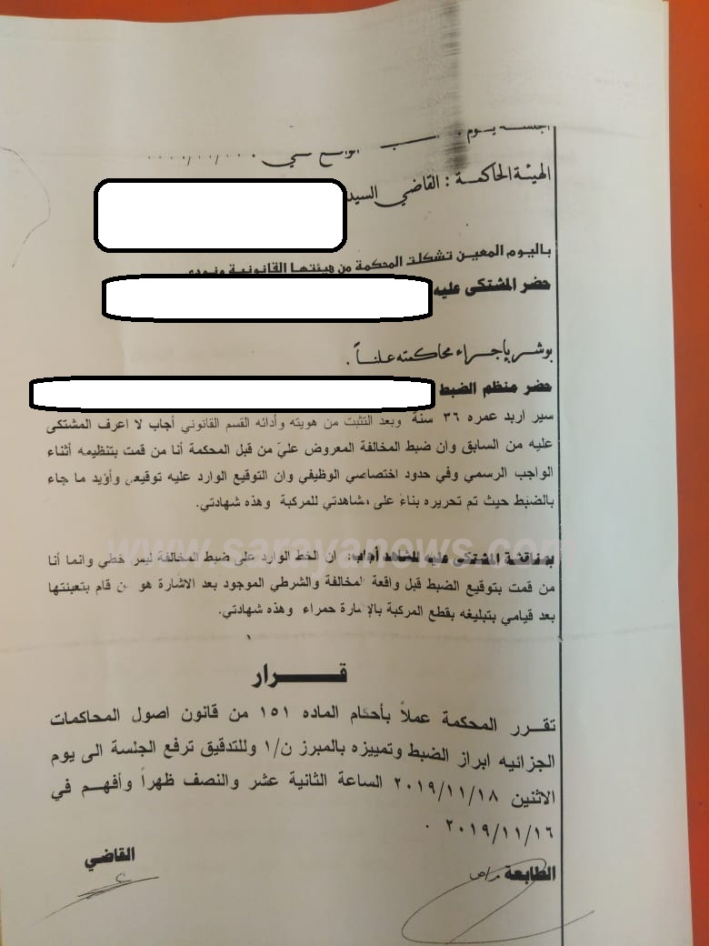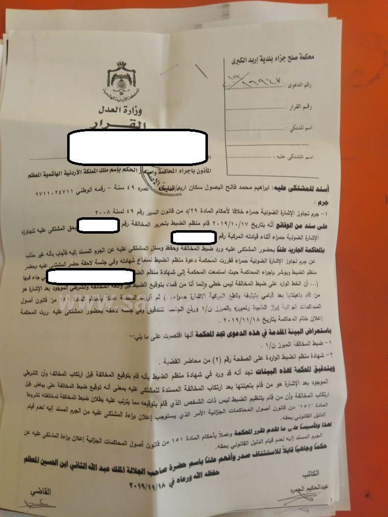سرايا - اربد_ يوسف قطيش_ قررت محكمة صلح جزاء بلدية اربد اليوم الإثنين شطب مخالفة سير "قطع الاشارة الحمراء" عن مواطن بسبب تضارب توقيع منظم الضبط مع من قام بتعبئة البيانات.