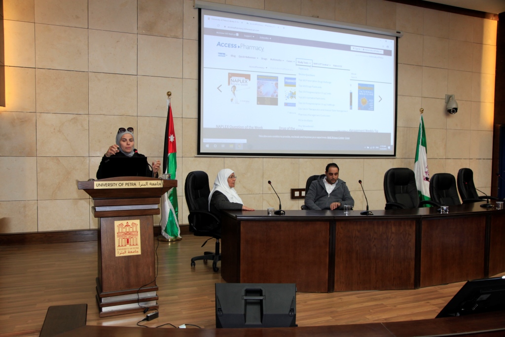 سرايا - نظمت مكتبة جامعه البترا دورة تدريبية عن استخدام البيانات المتخصصة بالصيدلة بالتعاون مع شركة تكنولودج قدمتها الدكتورة غادة الخياط ، لطلبة كلية الصيدلة تهدف الى التدريب على استخدام قواعد البيانات الخاصة بالصيدلة والوصول الى الأبحاث والكتب الالكترونية والدراسات الدوائية