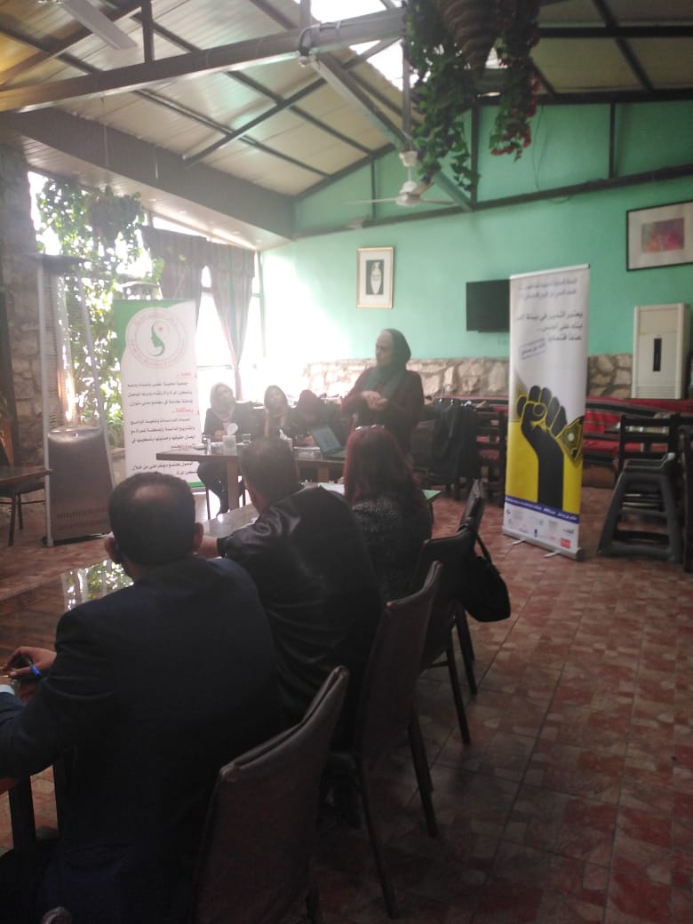 قامت الأستاذة مرام مغالسة من جمعية الدعم لتمكين المراة بالحديث عن العنف الاقتصادي ضد المرأة داخل الأسرة من محور قانوني وإشارت إلى أن العنف الاقتصادي ضد المرأة هو شكل من أشكال العنف الذي يمارس ضد المرأة حيث يتم التحكم في قدرة المرأة على الوصول إلى الموارد الاقتصادية مما يترتب عليه عدم قدرتها على دعم نفسها ماديا مما يضطرها لان تكون تابعة للمعيل وقد أشارت إلى أمثلة عن العنف الاقتصادي والتي منها حرمان المرأة من الميراث وحرمانها من فرص التعليم وحرمانها من استحقاق الأجر الكامل ونوهت إلى أسباب العنف الاقتصادي العادات والتقاليد البالية التي تعيب عمل المرأة وتعتبر عملها تخلي عن أدوارها الأساسية في رعاية أفراد الأسرة بالإضافة إلى الفهم الخاطئ للدين والتشريعات المميزة ضد المرأة وانخفاض مستوى الوعي بقضية المرأة مما يزيد من فرص العنف الاقتصادي الموجه ضد المرأة ويؤثر سلبا على إجمالي الانتاج وإشارت إلى حق المرأة في رفع دعوى نفقة زوجة او نفقة أقارب واللجوء للمحاكم الشرعية وتحسب النفقة من تاريخ الطلب ويقع على الزوجة عبء إثبات يسار الزوج ولكن قد تتعرض إلى صعوبات والتي منها عدم كفاية نفقتها في تأمين احتياجاتها الأساسية وأكدت على ان الزوجة غير ملزمة بالإنفاق على اولادها وأخلاقها بحكم الصدقة ولا تستطيع الرجوع للزوج للمطالبة به ومن الأمثلة الأخرى سلب ممتلكات الزوجة والحرمان من الميراث او الأجبار على التخارج والأجبار على اخذ القروض مما يسبب شعور التبعية الاقتصادية والثقافية المرأة مما يحولها إلى غارمة مهددة بالحبس