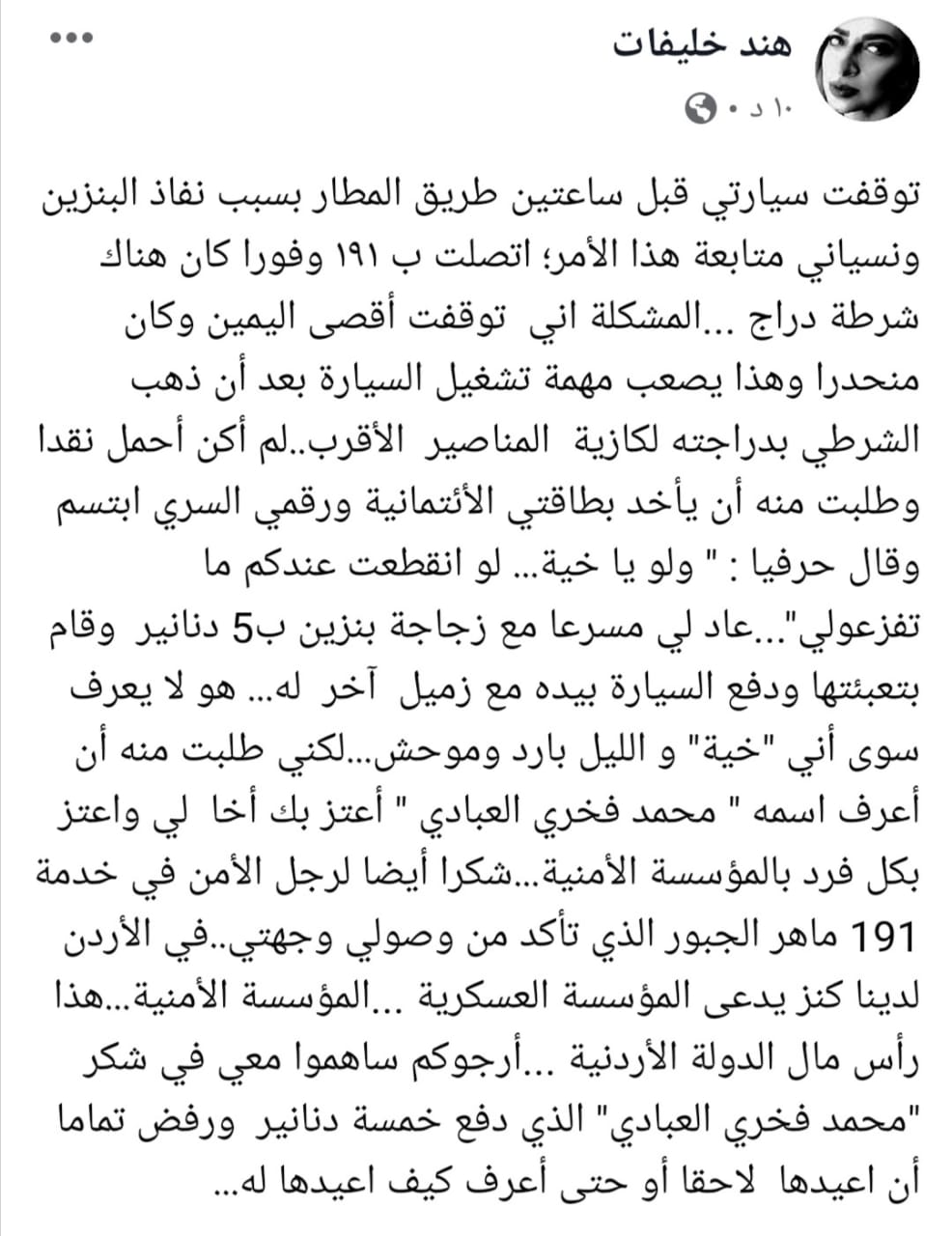 وقالت خليفات: توقفت سيارتي قبل ساعتين طريق المطار بسبب نفاذ البنزين ونسياني متابعة هذا الأمر؛ اتصلت ب ١٩١ وفورا كان هناك شرطة دراج …المشكلة اني توقفت أقصى اليمين وكان منحدرا وهذا يصعب مهمة تشغيل السيارة بعد أن ذهب الشرطي بدراجته لكازية المناصير الأقرب..لم أكن أحمل نقدا وطلبت منه أن يأخد بطاقتي الأئتمانية ورقمي السري ابتسم وقال حرفيا : ” ولو يا خية… لو انقطعت عندكم ما تفزعولي”…عاد لي مسرعا مع زجاجة بنزين ب5 دنانير وقام بتعبئتها ودفع السيارة بيده مع زميل آخر له… هو لا يعرف سوى أني “خية” و الليل بارد وموحش…لكني طلبت منه أن أعرف اسمه ” محمد فخري العبادي ” أعتز بك أخا لي واعتز بكل فرد بالمؤسسة الأمنية…شكرا أيضا لرجل الأمن في خدمة 191 ماهر الجبور الذي تأكد من وصولي وجهتي..في الأردن لدينا كنز يدعى المؤسسة العسكرية …المؤسسة الأمنية…هذا رأس مال الدولة الأردنية …أرجوكم ساهموا معي في شكر “محمد فخري العبادي” الذي دفع خمسة دنانير ورفض تماما أن اعيدها لاحقا أو حتى أعرف كيف اعيدها له…