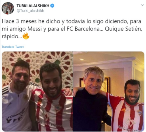 - المستشار تركي آل الشيخ رئيس نادي ألميريا، أحد أندية الدرجة الثانية في إسبانيا، كان قد نشر تغريدة مساء أمس، قال فيها أنه نصح صديقه ليونيل ميسي منذ 3 أشهر بتولي المدرب كيكي سيتين قيادة الفريق الكتالوني..فهل كانت مجرد نبوءة؟