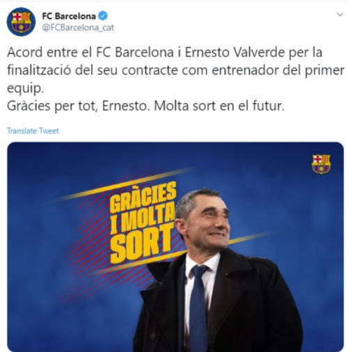 اتفاق بين برشلونة وإرنستو فالفيردي على إنهاء عقده كمدرب للفريق الأول..شكرا على كل شيء ارنستو.. حظا سعيدا في المستقبل.