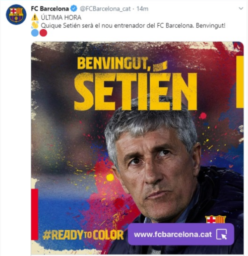 كما أعلن برشلونة عن تعيين المدرب كيكي سيتين خلفا لفالفيردي حتى عام 2022، حيث رحب عبر صفحته على تويتر بالمدرب الجديد بالقول: "كيكي سيتين سيكون المدرب الجديد لنادي برشلونة. أهلا وسهلا بك"
