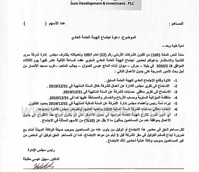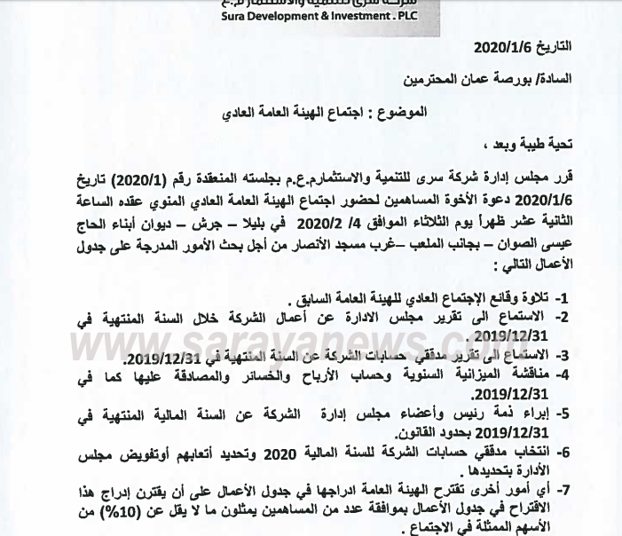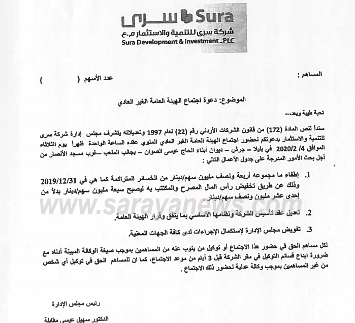 سرايا - خاص - قرر مجلس ادارة شركة سرى للتنمية والاستثمار عقد اجتماع غير عادي في مدينة جرش منطقة يبلا وذلك لمناقشة اطفاء ما مجموعه 4.5 مليون سهم/دينار من الخسائر المتراكمة كما هي 31/12/2019 وذلك عن طريق تخفيض رأس المال من 11 مليون ونصف سهم/دينار الى 7 ملايين سهم/دينار وذلك يوم الثلاثاء الموافق 4/2/2020.