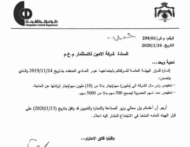 جاء ذلك بموجب كتاب رسمي واطلعت عليه سرايا يحمل الرقم 8/9/أ.ع/80، وذلك استناداً لأحكام المادة 15/ب/1 من تعليمات ادراج الاوارق المالية في بورصة عمان، وبالاشارة الى كتاب دائرة مراقبة الشركات تاريخ 16/1/2020 بخصوص قرار وزارة الصناعة والتجارة بالموافقة على تخفيض رأس مال الشركة.