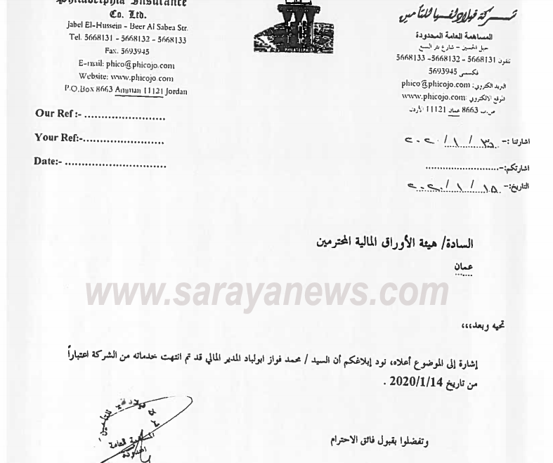 خاص - علمت سرايا انه تم انهاء خدمات المدير المالي في شركة فيلادلفيا للتأمين، وفق كتاب رسمي اطلعت عليه سرايا.