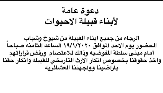 وبناء على ذلك نؤكد لأصحاب القرار اننا لن نتنازل عن المضي في انتزاع و الحفاظ على حقوقنا في مناطق الواجهات العشائرية لقبيلة الاحيوات وفي حال عدم الاستجابة لنا فإن القبيلة بعشائرها ال 37 عشيرة تؤكد على حقها بالتصعيد واستخدام كافة الإجراءات التي تحقق مطالبها التي تتناسب مع امتدادها التاريخي في المنطقة ضمن خطوات تصعيدية سيتم الاعلان عنها لاحقا..