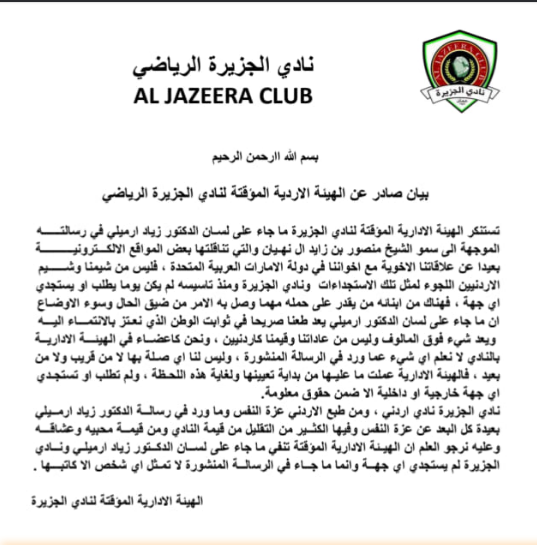 سرايا - أعلن نادي الجزيرة عبر صفحته الرسمية على موقع التواصل الاجتماعي فيسبوك بيانا صدر من الهيئة الادارية المؤقتة في النادي تستنكر ما جاء على لسان الدكتور زياد الرميلي في رسالته التي وجهها الى رئيس نادي الجزيرة الاماراتي طالبا فيها مد يد العون لانقاذ النادي من الازمة المالية التي يمر بها .