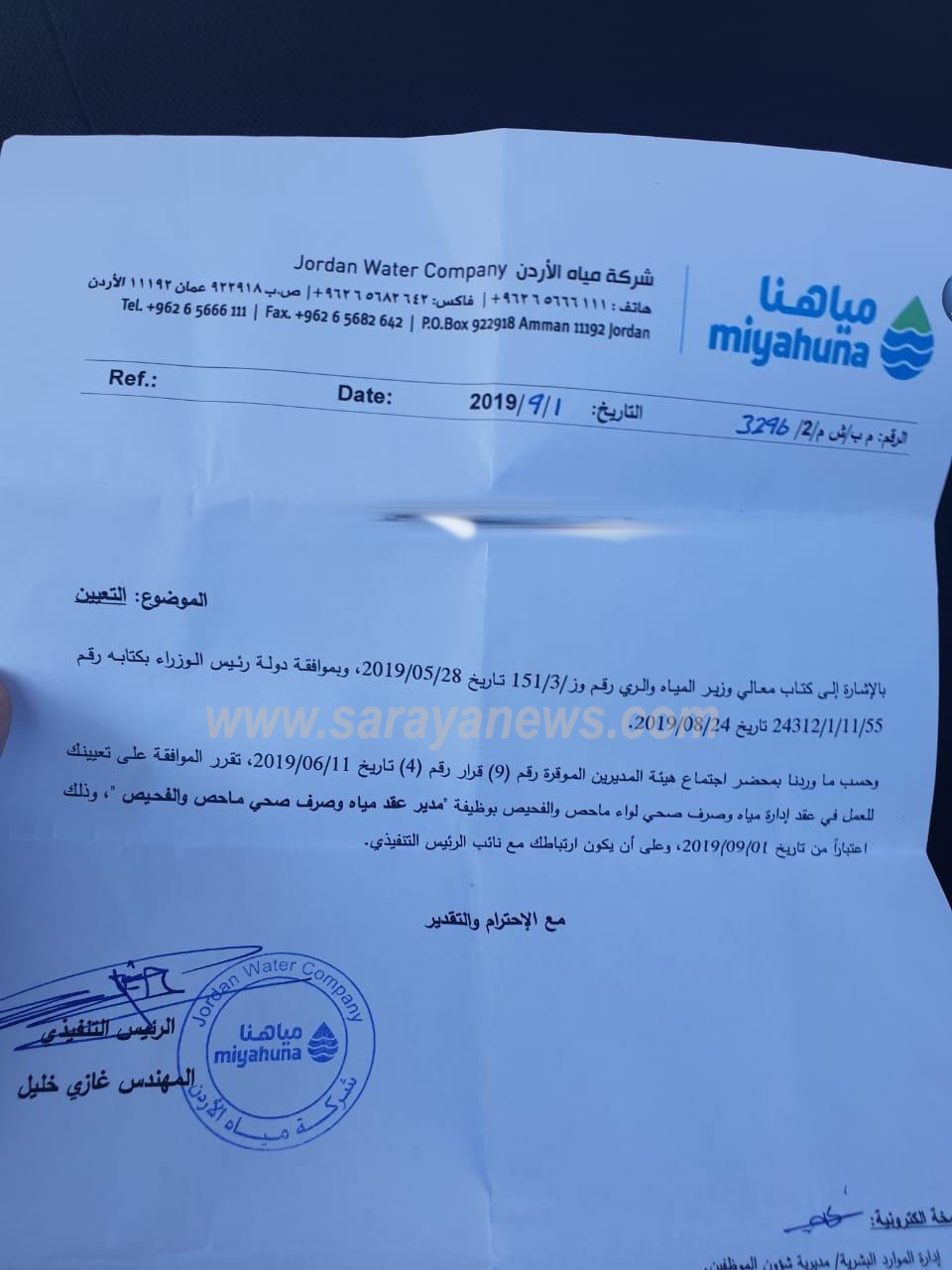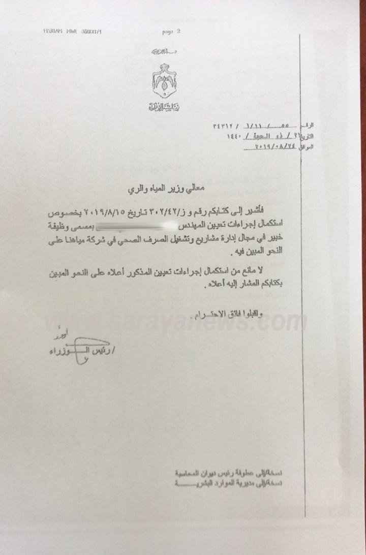 و يٌشير الكتاب الذي حمل عنوان "التعيين" إلى موافقة رئيس الوزراء عمر الرزاز و بتنسيب من وزير المياه و الري، رائد أبو السعود، للشخص المعني كخبير في إدارة المشاريع و الصرف الصحي.