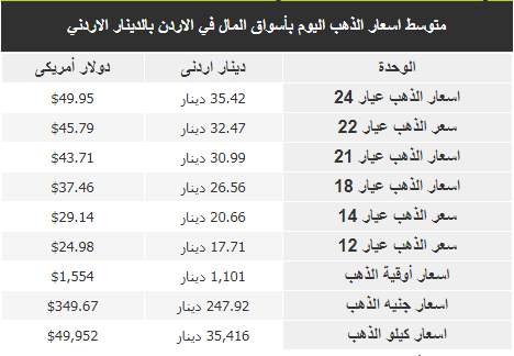 سرايا - رصدت سرايا التقرير الدوري والمتجدد لأسعار الذهب الاربعاء 22-01-2020 بالدينار الأردني وأيضا الدولار الأمريكي.يشمل التقرير أسعار المعدن بجميع عياراته (عيار 24, 22, 18, 14, 12) في الاردن.