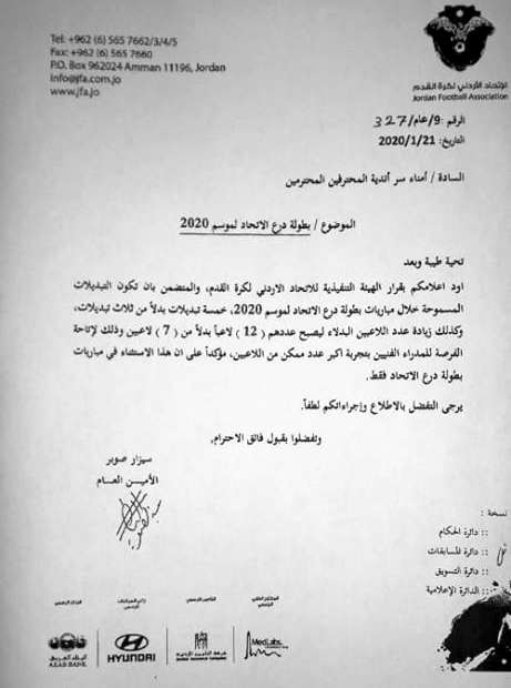 سرايا - قرر اتحاد كرة القدم، السماح باجراء خمسة تبديلات، خلال منافسات بطولة درع اتحاد الكرة 2020، والتي ستنطلق يوم الثلاثاء 28 كانون الثاني الجاري.