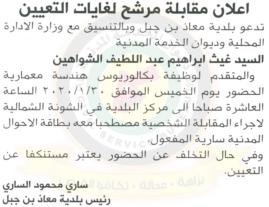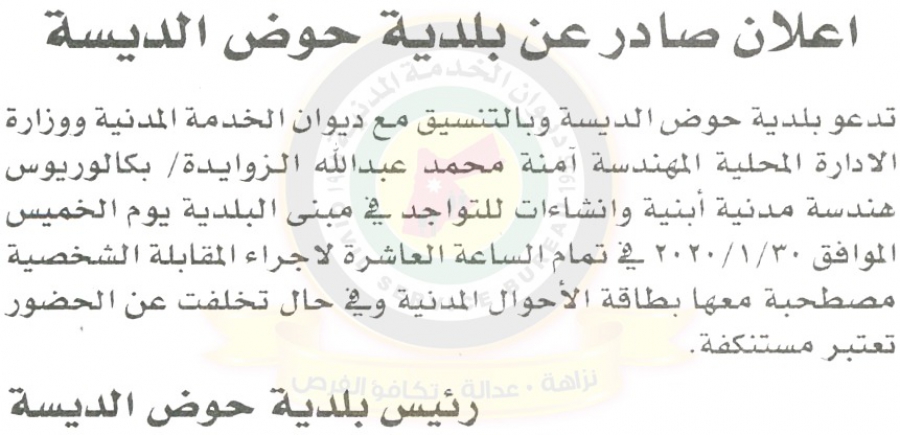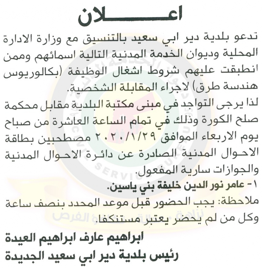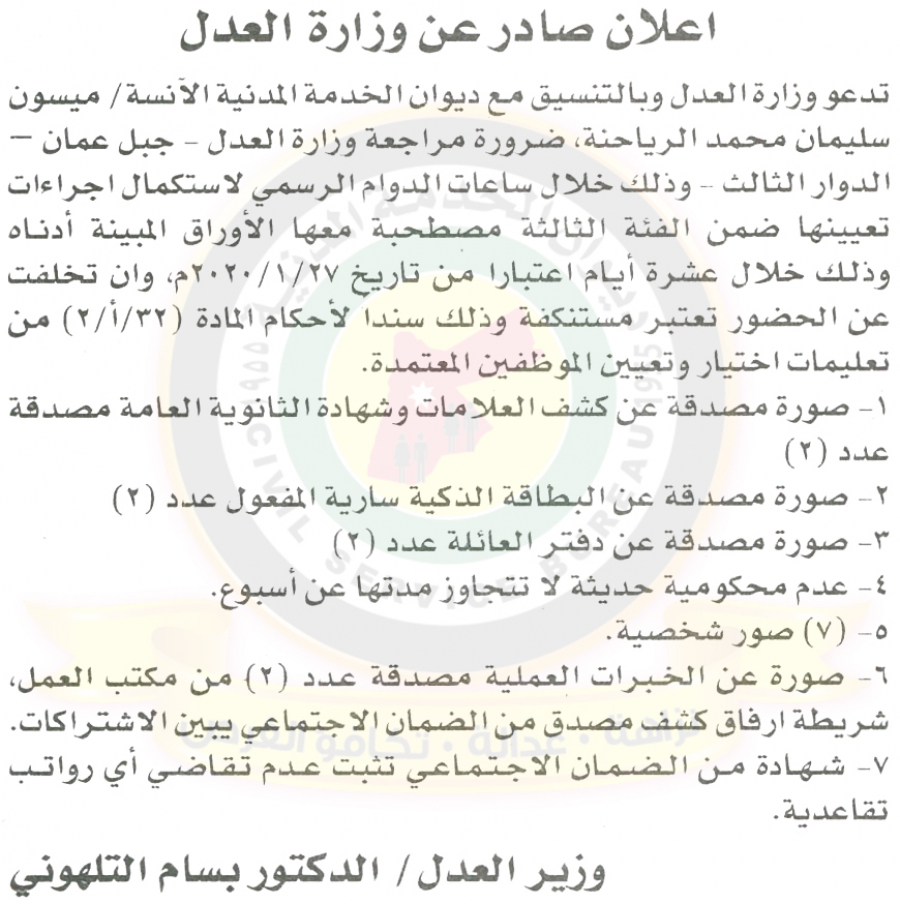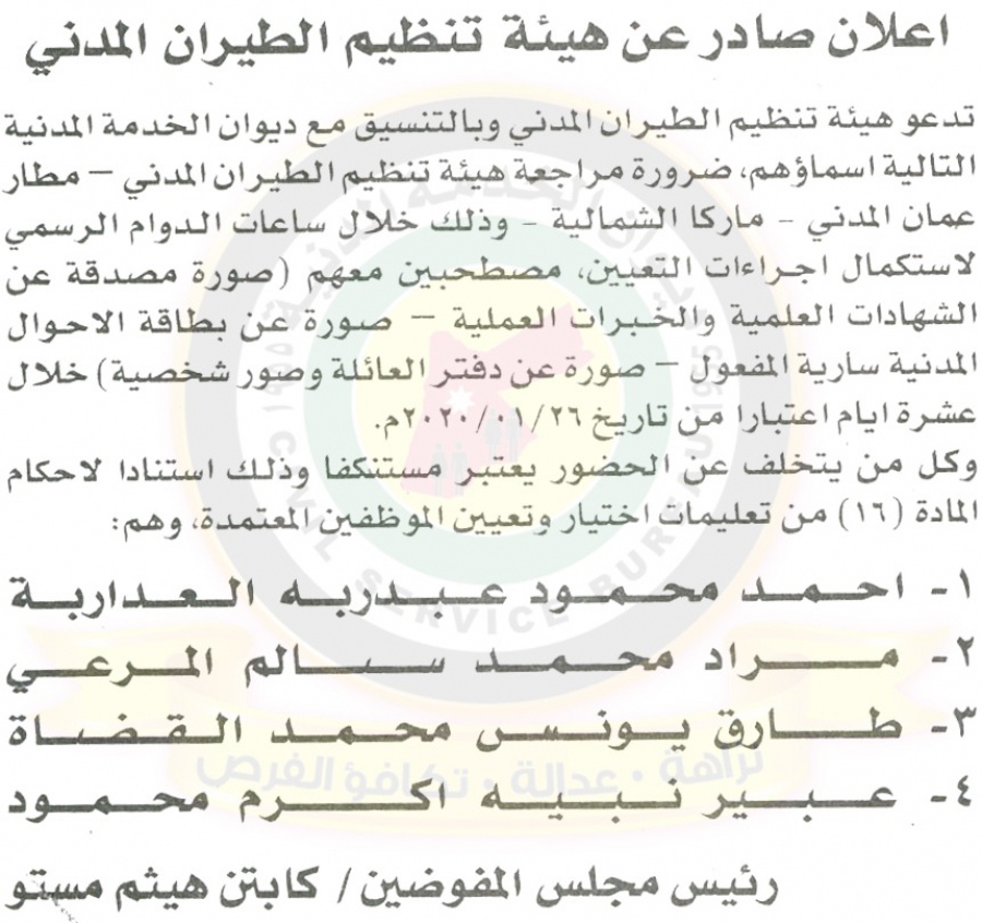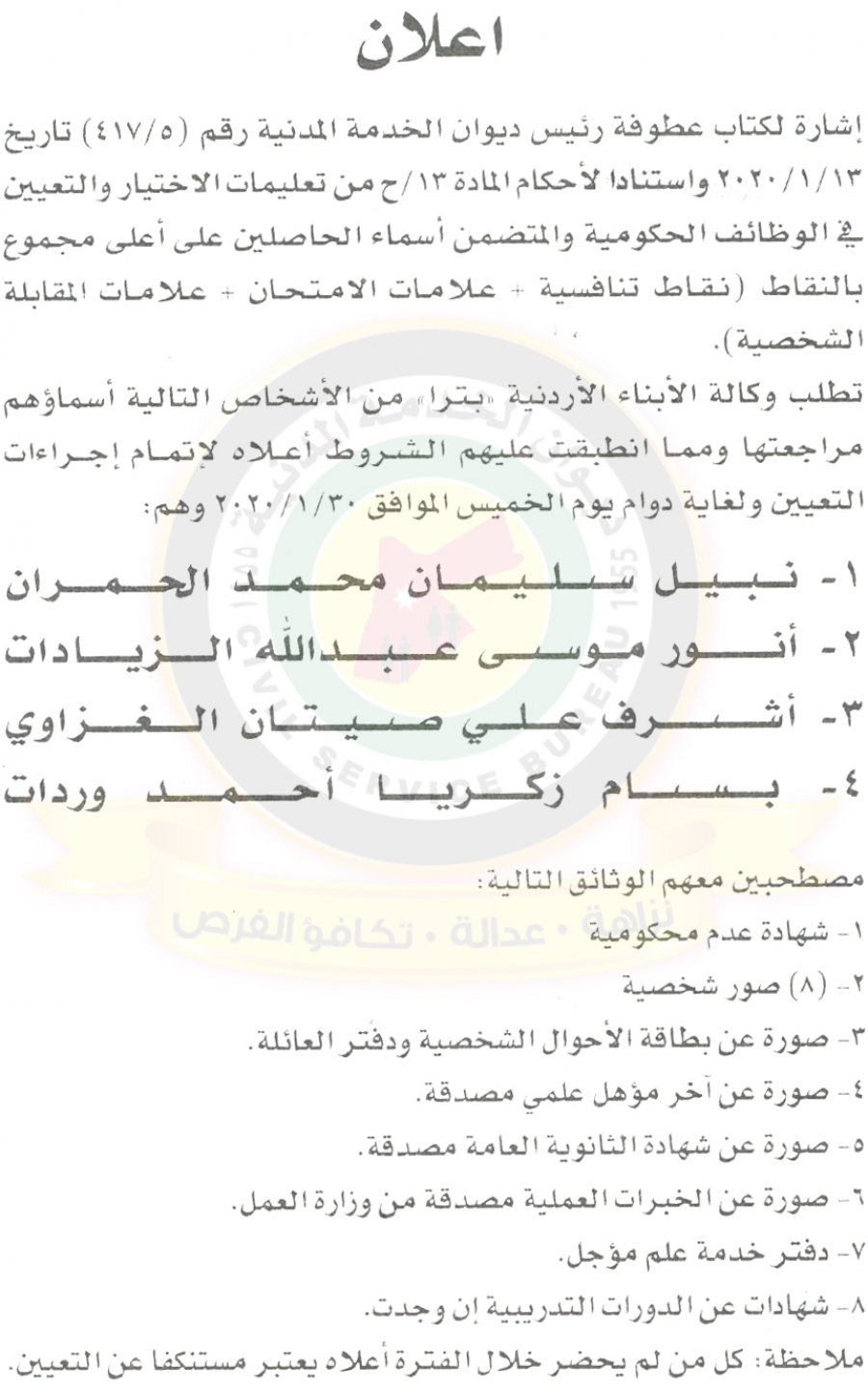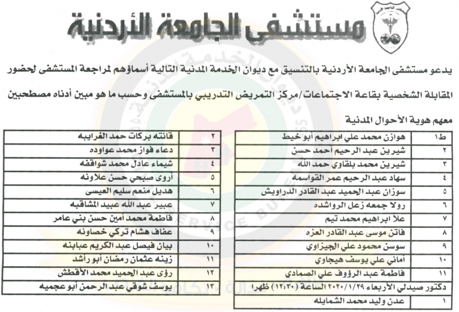 سرايا - دعا ديوان الخدمة المدنية بالتعاون مع مختلف الوزارات والمؤسسات الحكومية، التالية اسماؤهم لاجراء المقابلات الشخصية وعقد الامتحان التنافسي لغايات التعيين.