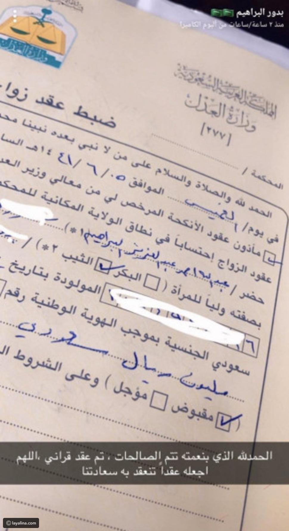 سرايا - نشرت السعودية بدور البراهيم لقطات من عقد قرانها على حسابها على سناب شات، كشف عن زواجها بمهر مليون ريال، وهو المبلغ الذي أكدت العام الماضي على أنها لن تقبل أن تتزوج إلا به