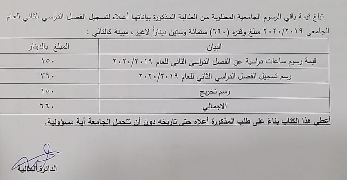 وفي التفاصيل ناشدت طالبة جامعية اهل الخير مساعدتها لاكمال دراستها الجامعية حيث انها لا تستطيع دفع الرسوم المترتية عليها والتي تبلغ 660 دينار.