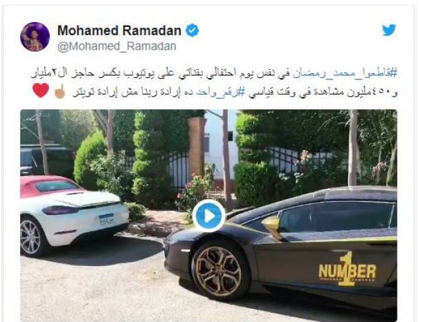 وسخر محمد رمضان في صفحته الشخصية على "تويتر"، من دعوات مقاطعته بنشر مقطع فيديو مستقلاً سيارته الفارهة وعلّق عليها قائلاً: "قاطعوا محمد رمضان في يوم احتفالي بقناتي على "يوتيوب" بكسر حاجز 2 ملياري و450 مليون مشاهدة في وقت قياسي... رقم واحد ده إرادة ربنا مش إرادة تويتر".