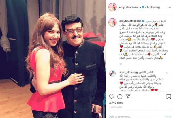 ونشرت عبر صفحتها الشخصية على "إنستجرام"، صورة جمعتها بسمير غانم وعلقت: "كلمة في حق سمير غانم، الراجل ده هو الوحيد اللي مدلي إيده بعد وفاة بابا وصمم إني أكمل وشجعني بوقوفي جنبه على خشبة المسرح، وده طبعاً شرف ليا غير إنه مربيني من صغري".