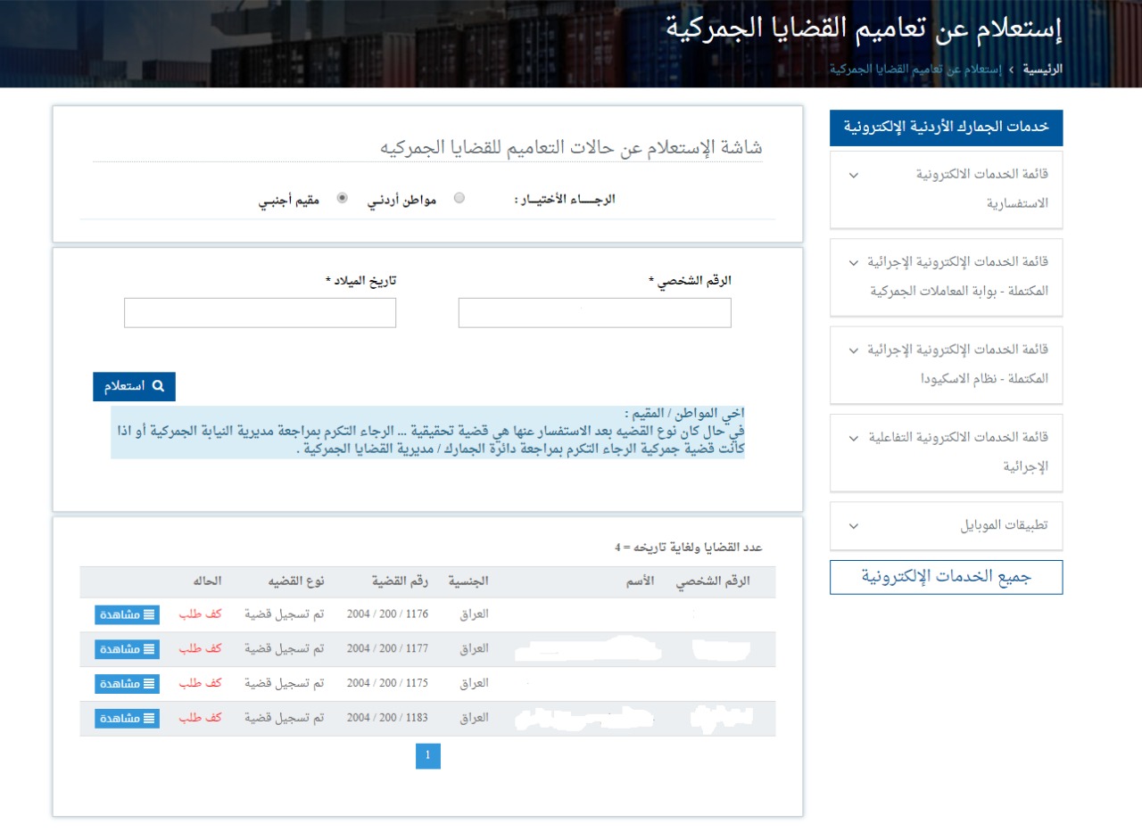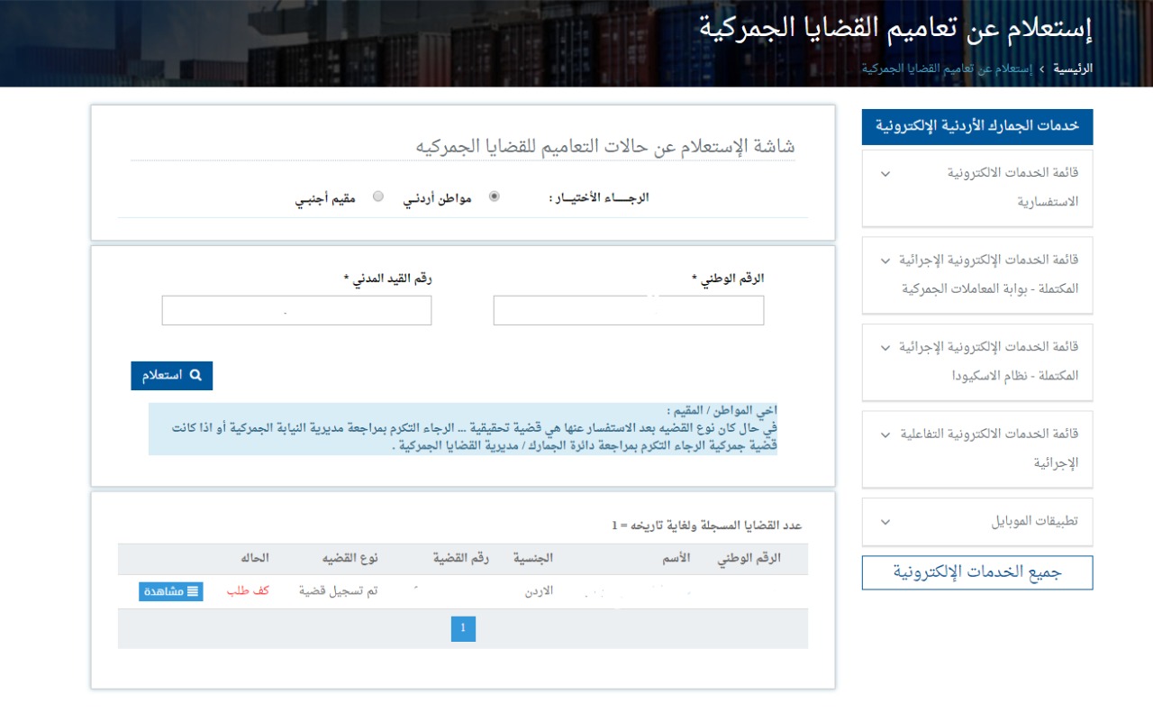 سرايا - أطلقت الجمارك الاردنية خدمة الاستعلام عن منع السفر على الموقع الالكتروني للدائرة للاستعلام عن حالات القضايا الجمركية، حيث أصبح بامكان المواطنين والمقيمين من الاطلاع على أوضاعهم القانونية وتصحيحها وذلك قبل الشروع في إجراءات السفر.
