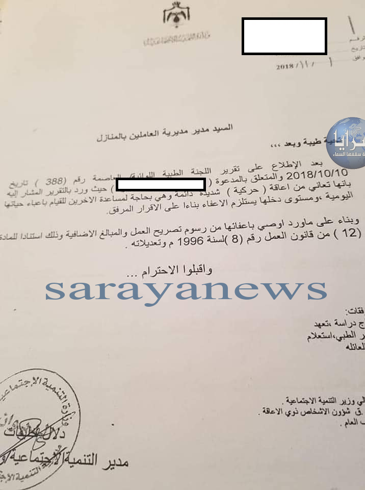وقال الناطق الاعلامي لوزارة التنمية الاجتماعية اشرف خريس لسرايا ان التقرير الطبي الصادر عن اللجان اللوائية معتمد حسب الاصول لمثل هذه المعاملات اضافة الى انطباق الشروط الاخرى لكونها تمتلك دفتر عائلة منفصل لكونها اسرة فرد.