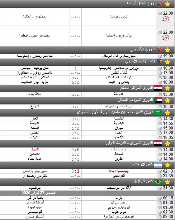 سرايا - رصدت "سرايا" أبرز المباريات ليوم الاربعاء 26-02-2020 على الملاعب العربية و الأوروبية و العالمية.