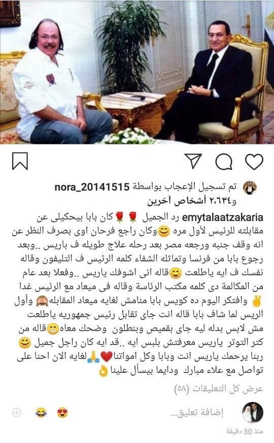 ونشرت عبر حسابها على "انستغرام" صورة اللقاء الذي جمع الثنائي وكتبت تحت عنوان "رد الجميل" كواليس ما حدث، مشيرة إلى أن الرئيس الأسبق وقف إلى جوار والدها وأعاده إلى مصر بعد رحلة علاج طويلة في باريس.