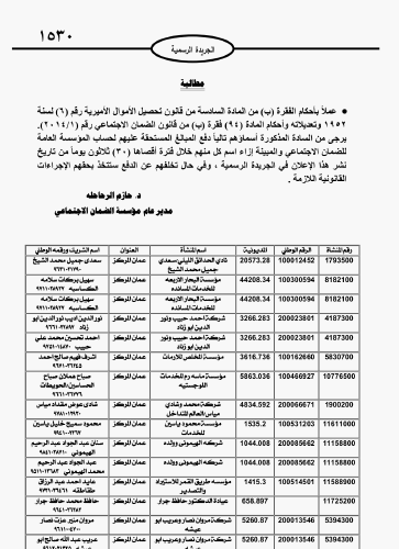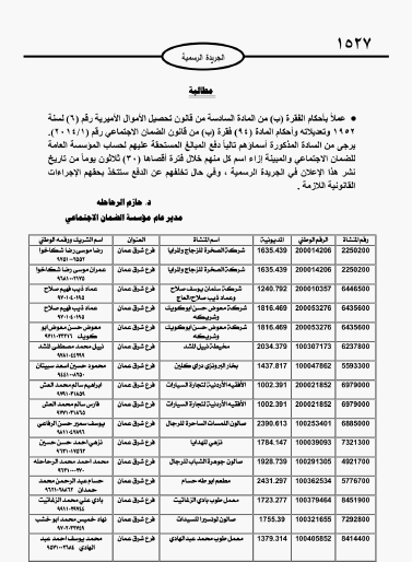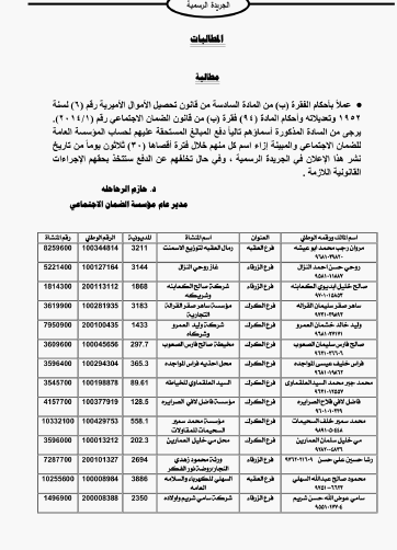 سرايا - دعت المؤسسة العامة للضمان الاجتماعي التالية اسماءهم دفع المبالغ المستحقة عليهم لحساب "الضمان " خلال فترة اقصاها 30 يوماً من تاريخ نشر الاعلان .