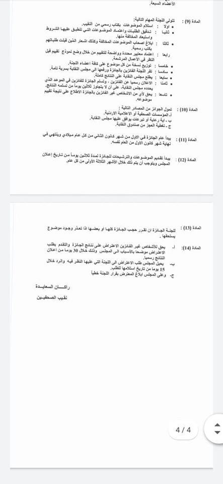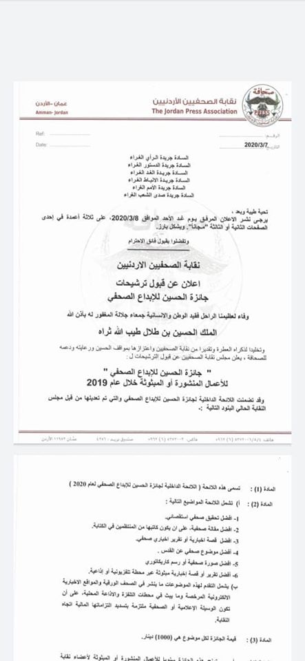 سرايا - عدل مجلس نقابة الصحفيين لائحة جائزة الحسين للابداع الصحفي الداخلية للعام 2020 بهدف معالجة الاختلالات في اللائحة التي تم تعديلها لتلبية المستجدات التي تقتضيها الجائزة وتلبية لمطالب الهيئة العامة.