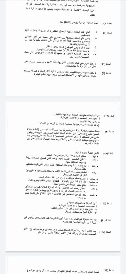 ويذكر ان التعديلات جاءت بهدف تجويد وتنقيح بعض الاختلالات بما ينسجم مع الحيادية والشفافية التي تقتضيها طبيعة عمل الجائزة وفاء لعظيمنا الراحل فقيد الوطن والانسانية جمعاء جلالة المغفور له باذن الله الملك الحسين بن طلال طيب الله ثراه وتخليدا لذكراه العطرة وتقديرا من نقابة الصحفيين واعتزازها بمواقف الحسين ورعايته ودعمه للصحافة.